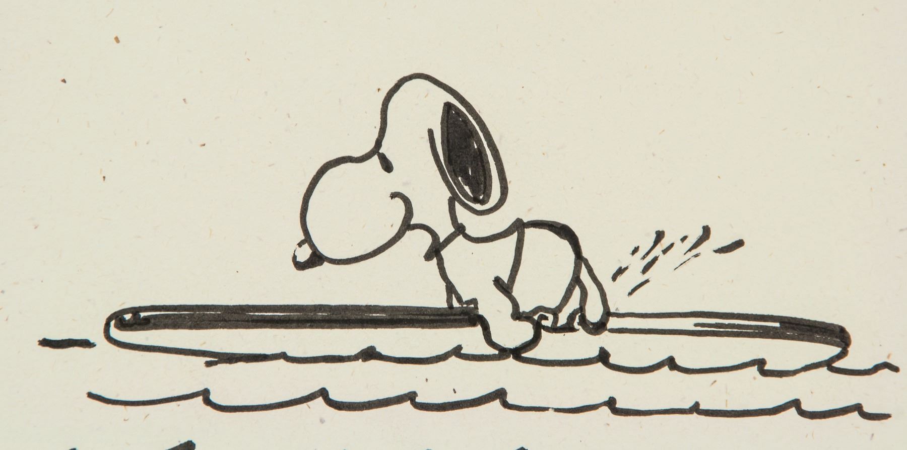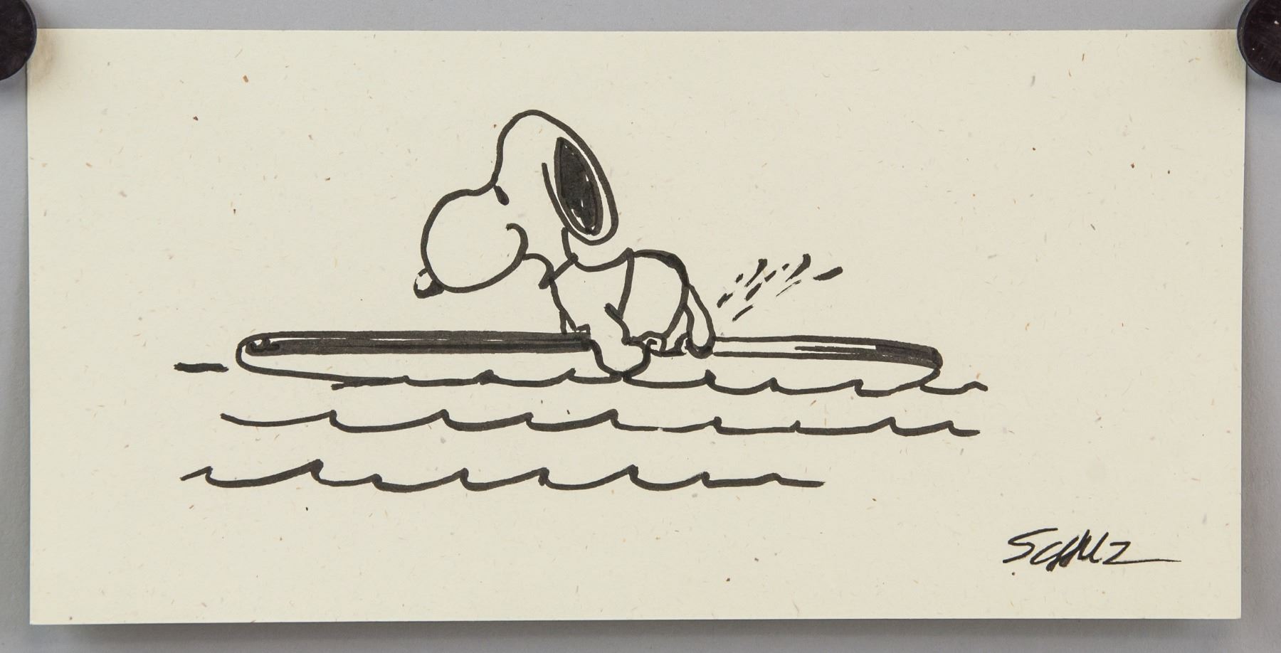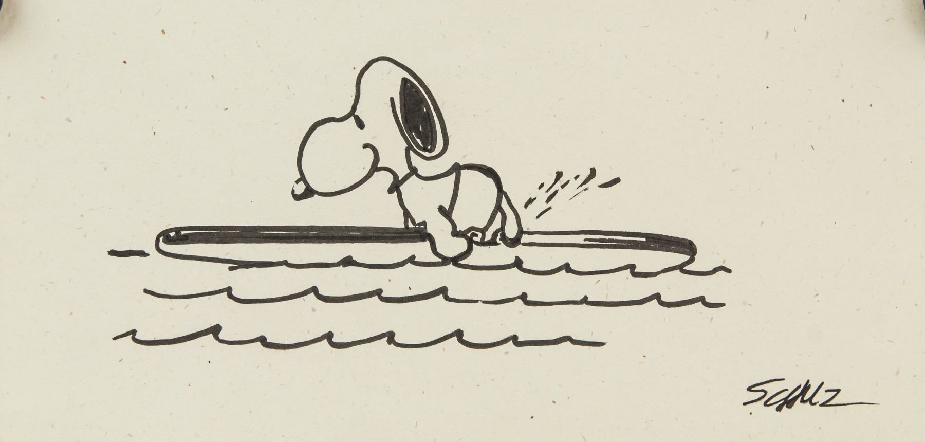 Ink on paper. Study featuring Snoopy paddleboarding. Signed and attr. Charles Schulz (American, 1922-2000) on the lower right corner. 11.5 x 23 cm (4.5 x 9.1 inches). Charles Schulz, born in Minneapolis, Minnesota, on November 26, 1922, launched his comic strip Peanuts in 1950. Featuring hero Charlie Brown, over the years the strip would run in more than 2,000 newspapers and in many languages. Peanuts also expanded into TV specials like the Emmy-winning A Charlie Brown Christmas, as well as books and a huge merchandise collection. Schulz died on February 12, 2000. PROVENANCE: Private estate (South America)