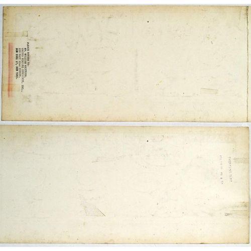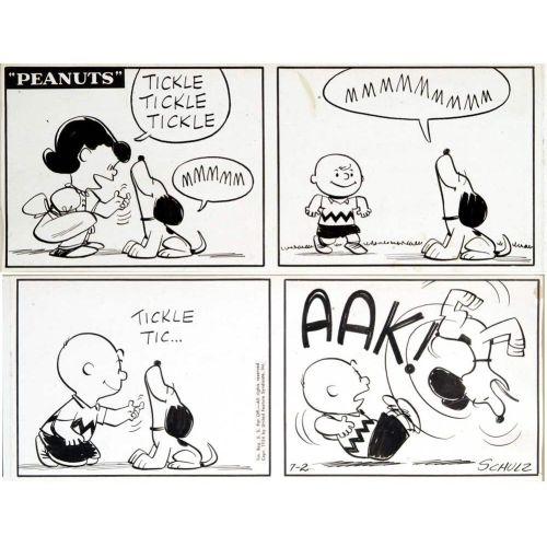 CHARLES SCHULZ "PEANUTS" ORIGINAL ARTWORK 6 3/4"x28 3/4" sheet, pen & ink, stamped verso by United Features Syndicate and dated June 18, 1954 CONDITION REPORT: glued around edges to back of matting, vertical crease in center (for mailing), this 1" stain in 2nd panel upper left, round 1/2" stain in 4th panel upper right. PACKING AND SHIPPING: We offer packing (double boxed in most cases) and shipping of this item within the Continental United States by USPS or UPS (our choice- boxes over 30lbs or oversized may be recalculated based on buyer's location), NOT INCLUDING INSURANCE (it will be added when we know the sales price) for $40