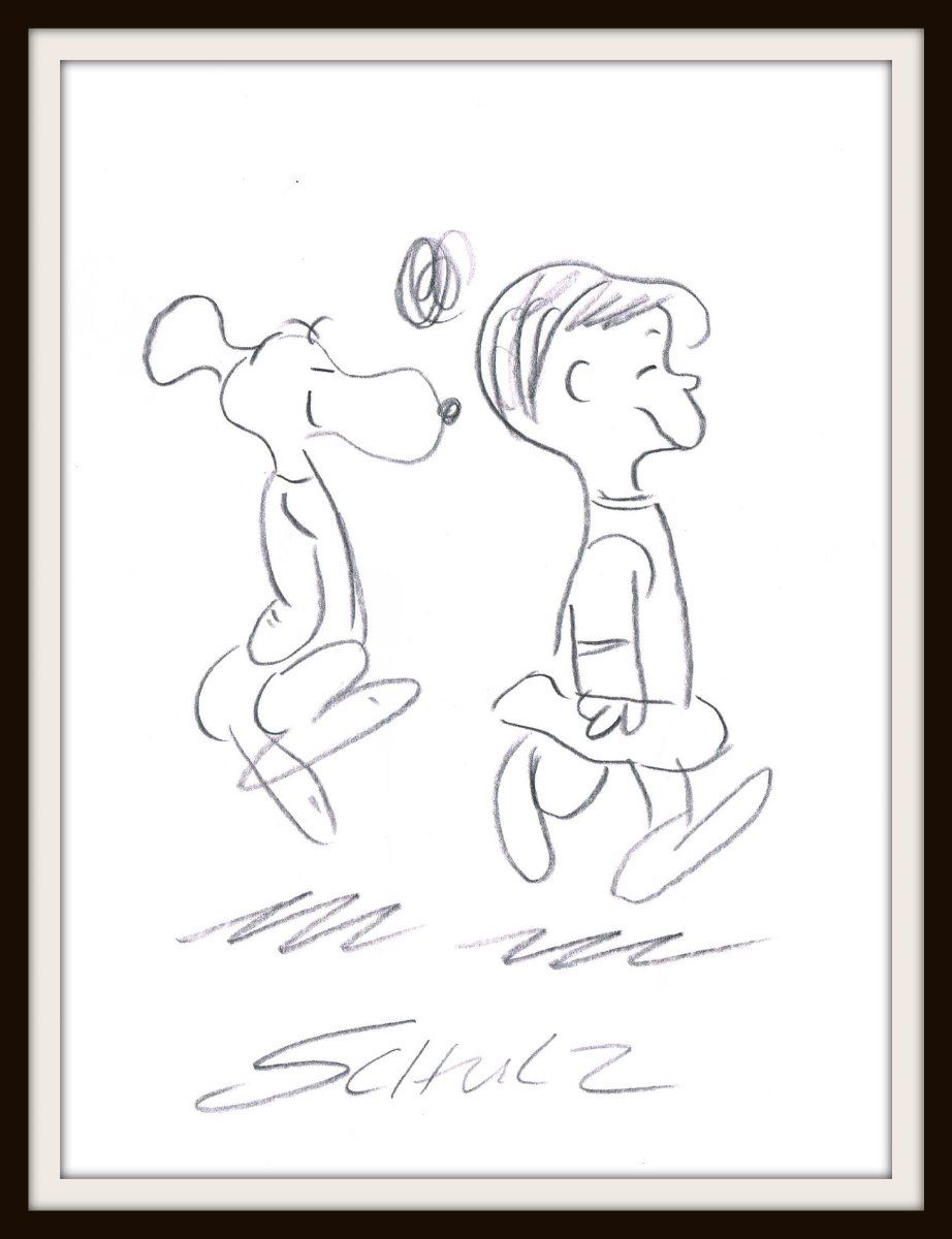 A drawing of Snoopy and Violet Gray by its Creator Charles Schulz. Rendered in pencil on A4 card and professionally mounted and framed in wood. Supplied with coa.