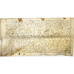 <b>964. (CHARLES V) </b>(1337 - 1380) King of France strengthened by the failure of the Jacquerie, regained lands from the English which they had received in ransom for his father, warred against Navarre and England. A document from his reign, 1p. oblong 4to., [n.p.], 1366, a grant and lease in Latin on parchment by Roman At, lord and inhabitant of the castle of Caylus, to Johan Marti, inhabitant of Espinas, in the territory of de la Roquilha. Slightly stained, else very good.<b> $200-300</b>