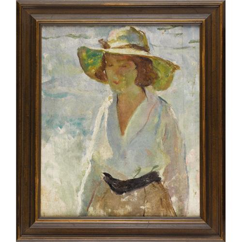 <B>CHARLES W. HAWTHORNE</B></I> (American 1872-1930)<BR><I>Untitled (Woman With Hat)</B></I><BR>Oil on canvas<BR>19 x 23 inches (48.3 x 58.4 cm)<BR><BR>Provenance:<BR>Mrs. Mildren S. Ruben (Tyler, Texas) <B>Condition Report:</B> evidence of repair, canvas patch on reverse. Paint loss in lower and upper left corners; upper right corner; and on right shoulder of figure<BR><BR><b>Shipping:</b> Requires 3rd Party Shipping (<a target="_blank" href="http://www.heritageauctions.com/common/shipping.php">view shipping information</a>)