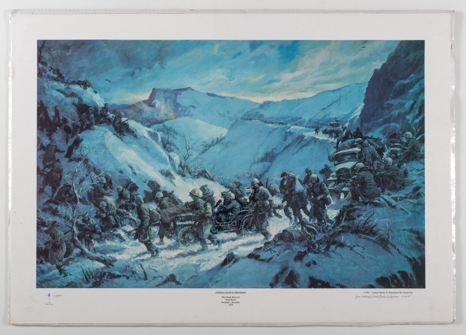 Eternal Band of Brothers - The Chosin Reservoir North Korea November-December 1950' by Charles Waterhouse, published in 1991. 24 x 34.25 inches. Signed by Charles Waterhouse. Waterhouse (1924-2013) was in the Marine Corps and participated in the Battle of Iwo Jima. He was awarded the 'USMC Artist in Residence', the Legion of Merit, and a Purple Heart.