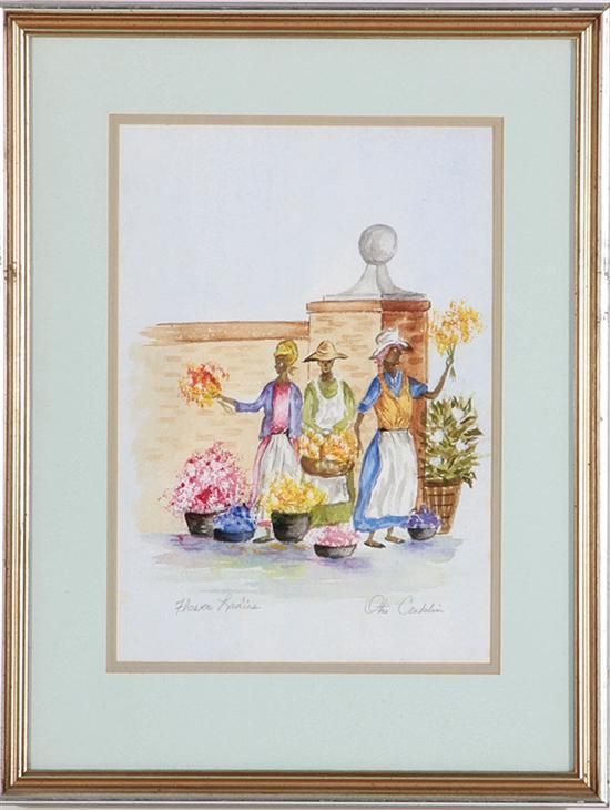 CHARLESTON FLOWER LADIES watercolor, framed, signed & titled: lower right, left and verso, Otis Conklin. sight size: H12in W8in Provenance: Charleston, South Carolina private estate