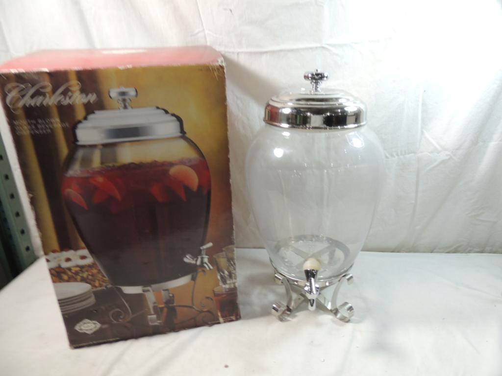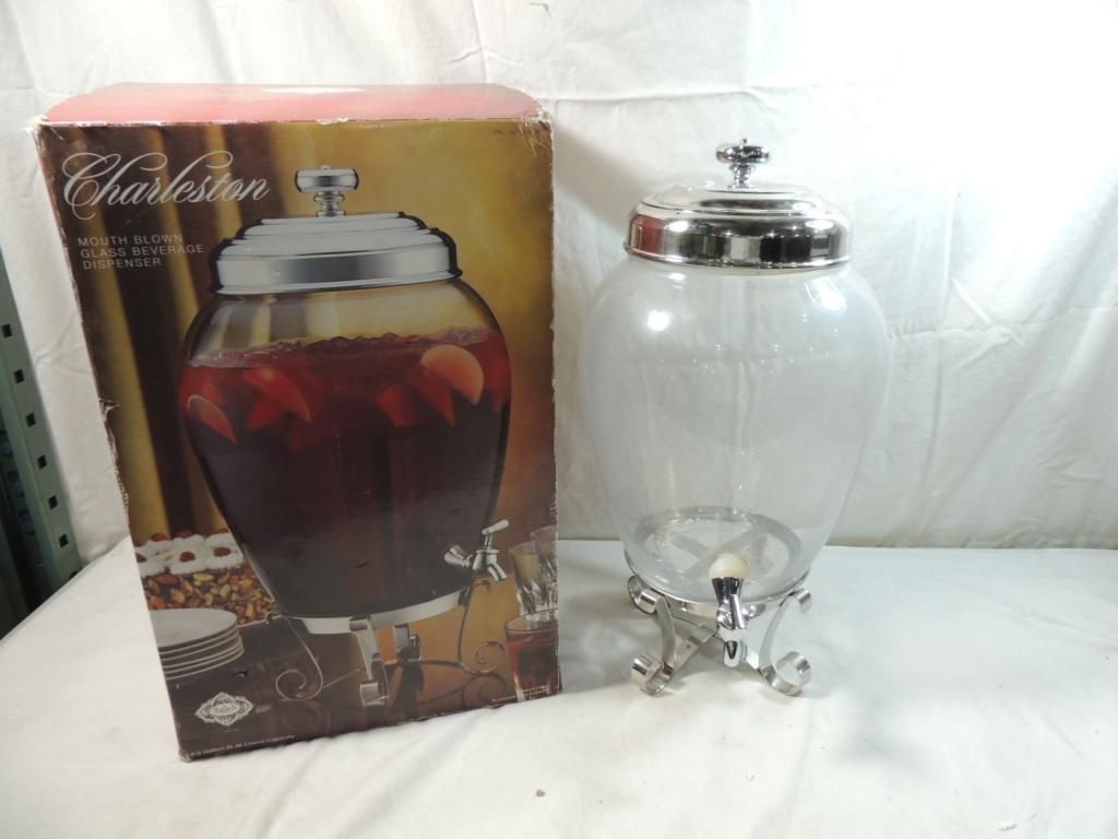 CHARLESTON MOUTH BLOWN GLASS BEVERAGE DISPENSER SHANNON CRYSTAL 2.5 GALLON CAPACITY AS SHOWN SEE PHOTO FOR MORE DETAILS.