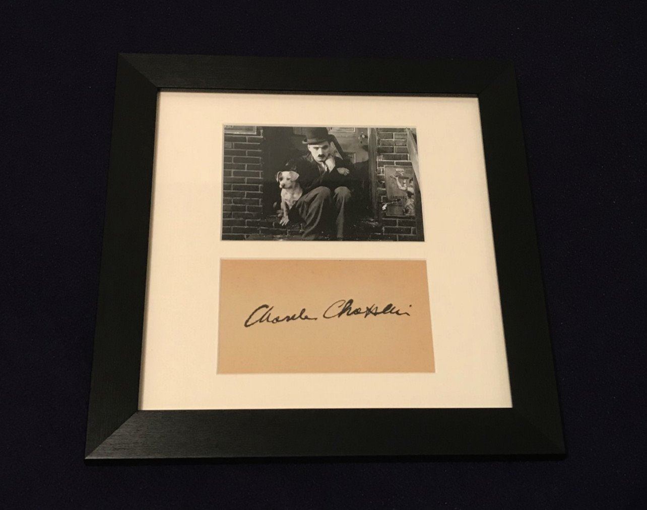A Charlie Chaplin autograph. Professionally mounted and framed. Condition: There is a crease through the autograph. Supplied with coa.