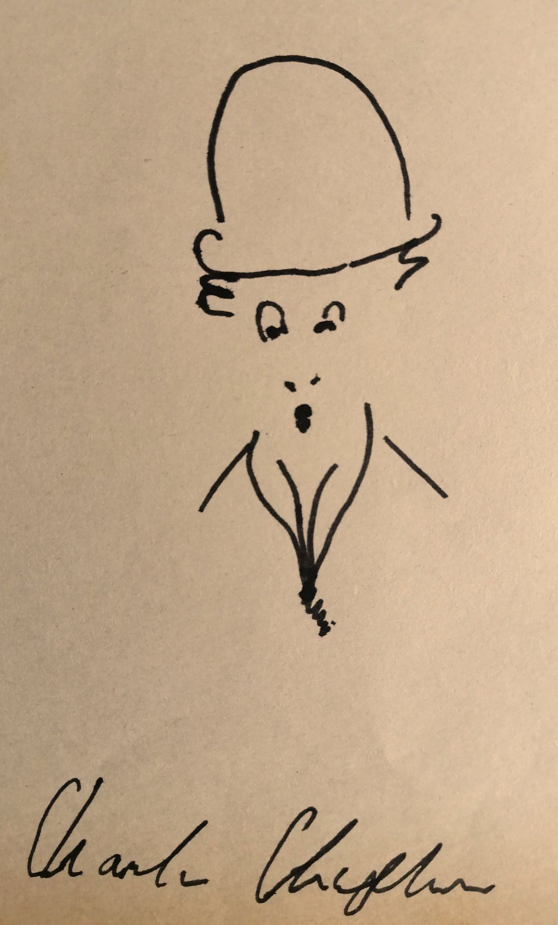 Charlie Chaplin signature and sketch of his most famous silent film character, 'The Tramp'. Size: 6x3.5 inches. Mounted, framed. With photo of Charlie chaplin. Supplied with coa.