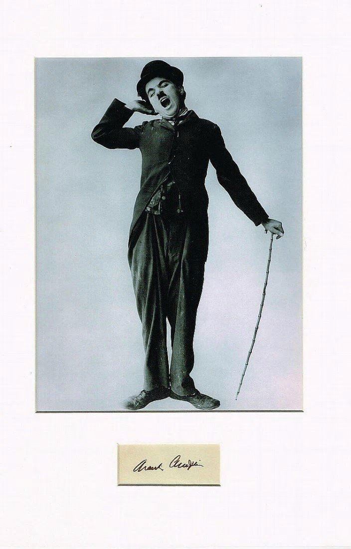 A piece of paper signed by 'The tramp' Charlie Chaplin together with a photo in a mount. Charlie was an English comic actor, filmmaker, and composer who rose to fame in the silent era. Chaplin became a worldwide icon through his screen persona the Tramp and is considered one of the most important figures in the history of the film industry. His career spanned more than 75 years, from childhood in the Victorian era until a year before his death in 1977, and encompassed both adulation and controversy.