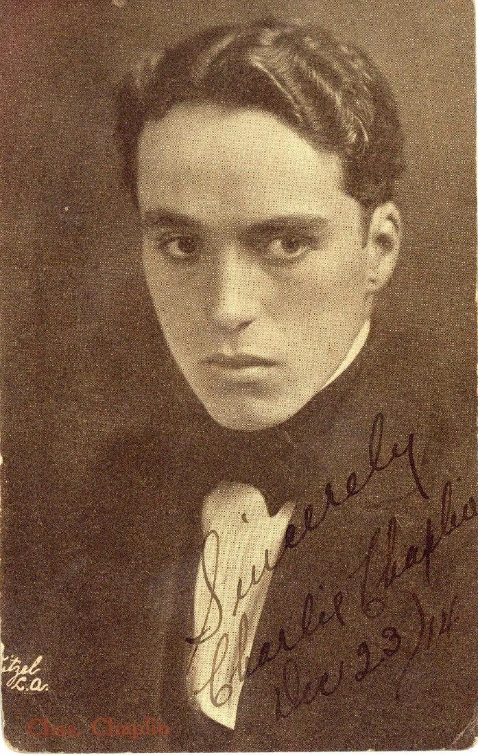 Vintage, sepia toned, head and shoulders postcard photograph of a young Chaplin, signed and dated "Sincerely, Charlie Chaplin, Dec 23/14"