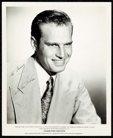 (1923-2008) American film actor, a leading man who won an Academy Award for Ben Hur, and also starred in The Ten Commandments and The Greatest Show On Earth. Very early I.S.P. 8" x 10" b/w, a 1952 studio portrait, nicely signed. Light creases at top and corners barely detract, else very good.