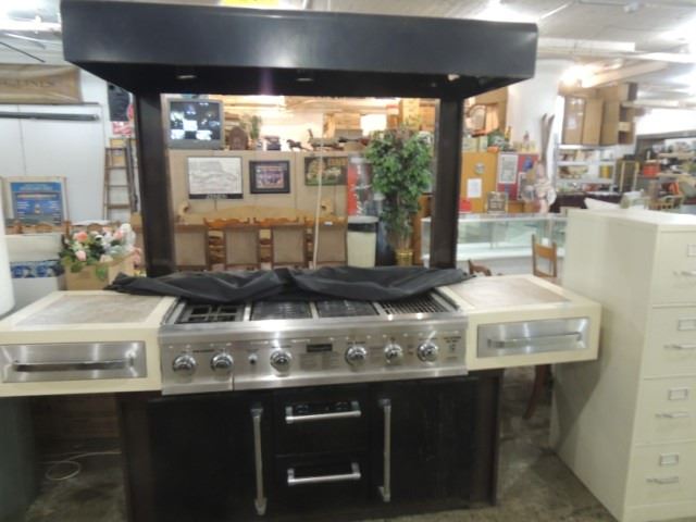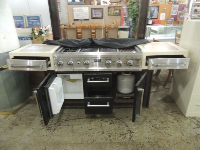 HUGE MASSIVE HIGH END OUTDOOR COOKING ISLAND COMPLETE WITH PROPANE GRILL AREA, SEARING AREA, BURNERS, SMOKING AREA, WARMING TRAY, HOOD WITH BUILT IN LIGHTS, BUILT IN REFRIGERATOR, STORAGE DRAWERS, SLIDING COVERS