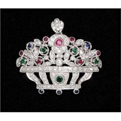 Designed as a basket of flowers, set with round cut diamonds, emeralds, rubies and sapphires forming leaves and flower heads. Mounted in eighteen karat white gold. $500/800