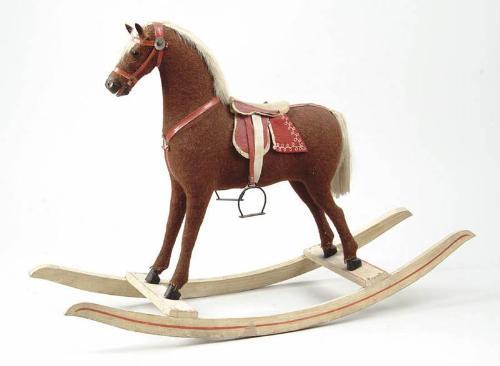 CHARMING DIMNUTIVE-SIZE STUFFED HOBBY HORSE ON STAND. This outstanding example of very small proportions for a very small child or doll. The felt-covered brown horse with hair, mane and tail retains all the red leather like harness complete with saddle and saddle blanket. On a pinstriped painted rocking base. Glass eyes and generally very nice features. SIZE: (rocking mechanism) 37" l, (horse only) 21" l x 22-1/2" h (to top of head). CONDITION: The felt and material generally strong and very good, wear to the paint pinstripe on the base, leather-type harness, hair and felt all structurally very good, some fading to red saddle and blanket. In general, an outstanding example. 1-5940