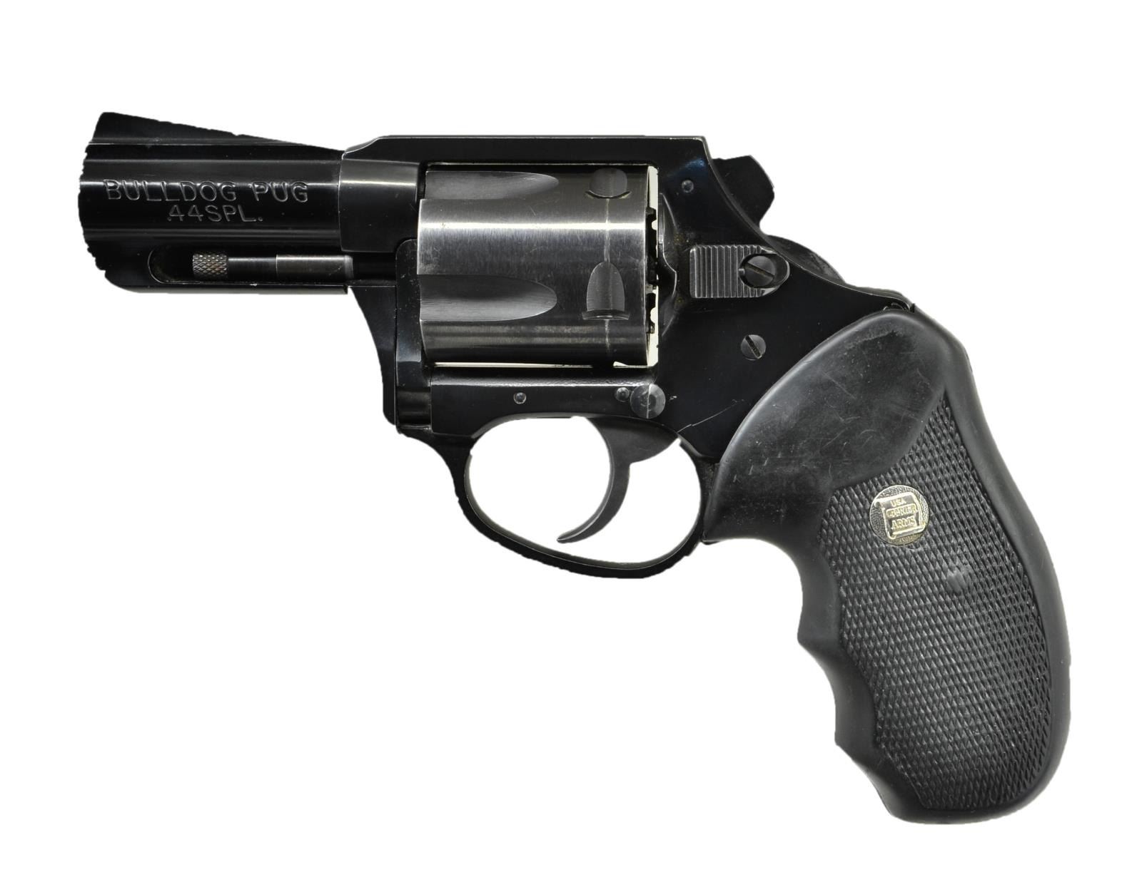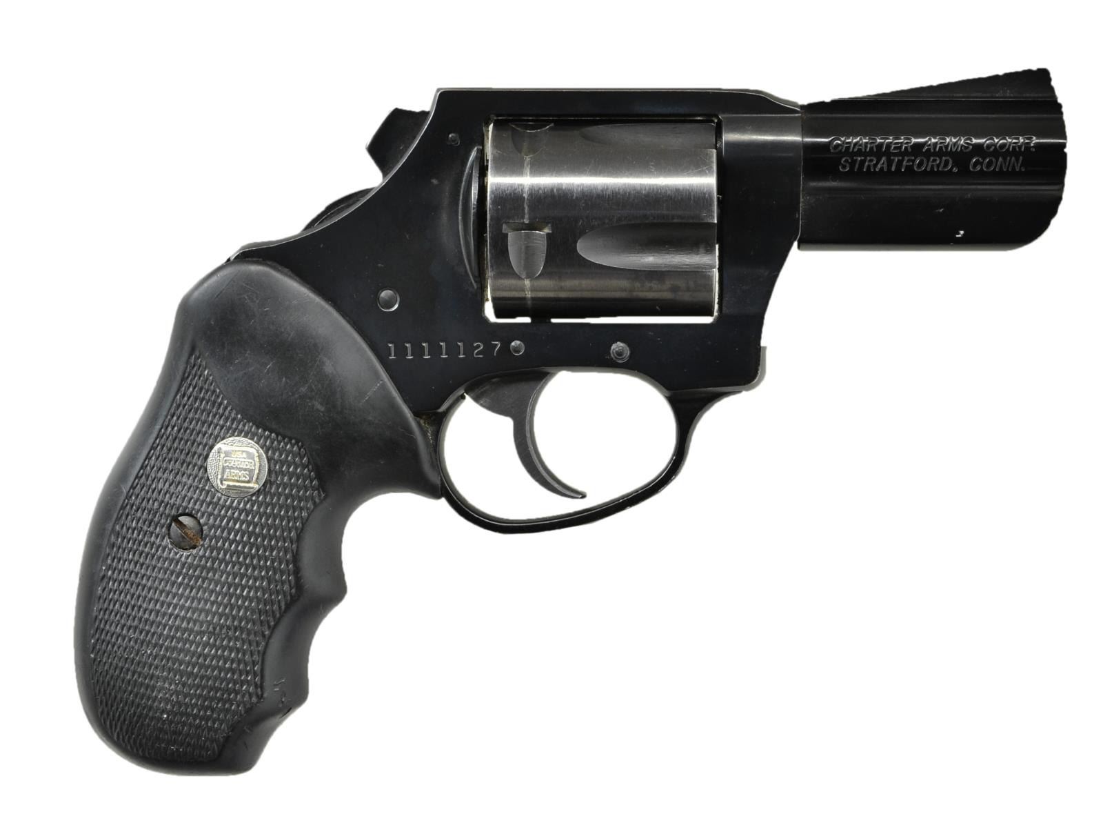 Cal. 44 Spl. S #1111127. Bbl. 2 1/2". Ramped serrated front sight. Stratford, CT made Bulldog. 5 shot cyl. Bobbed hammer. Anodized bbl. & trigger guard. Blued frame & cyl. Finger groove rubber grips w/ silver Charter Arms medallions. CONDITION: grips show scattered dings & handling marks. Bbl. & triggerguard retain 93% anodized finish w/ some light flaking. Blued parts retain 90% blue w/ drag line on cyl & scattered thinning. Very good plus bore. (22-4339/MJC). MODERN. $300-400.