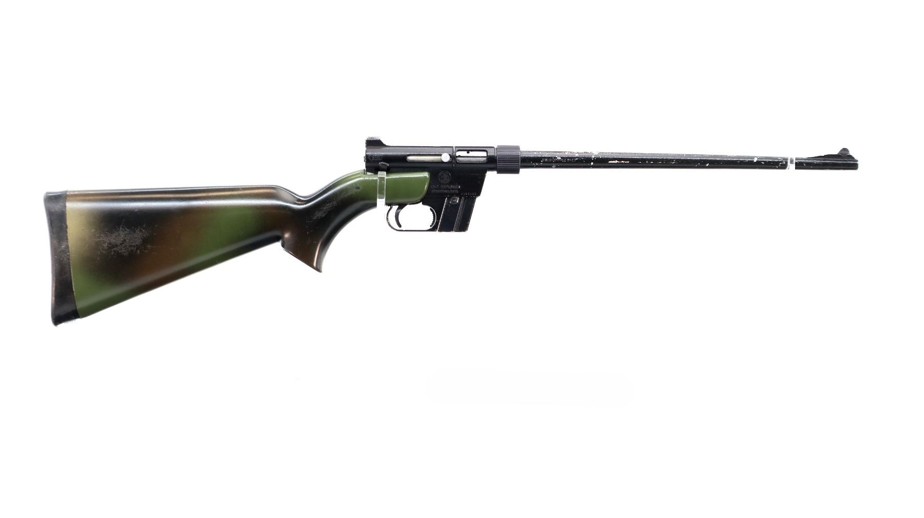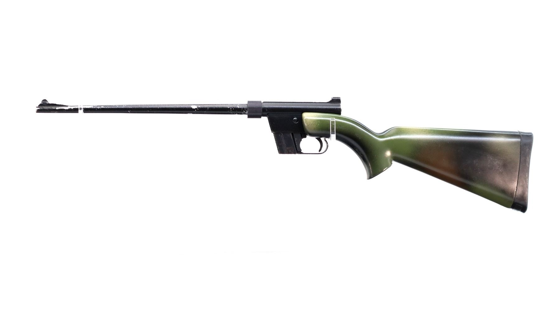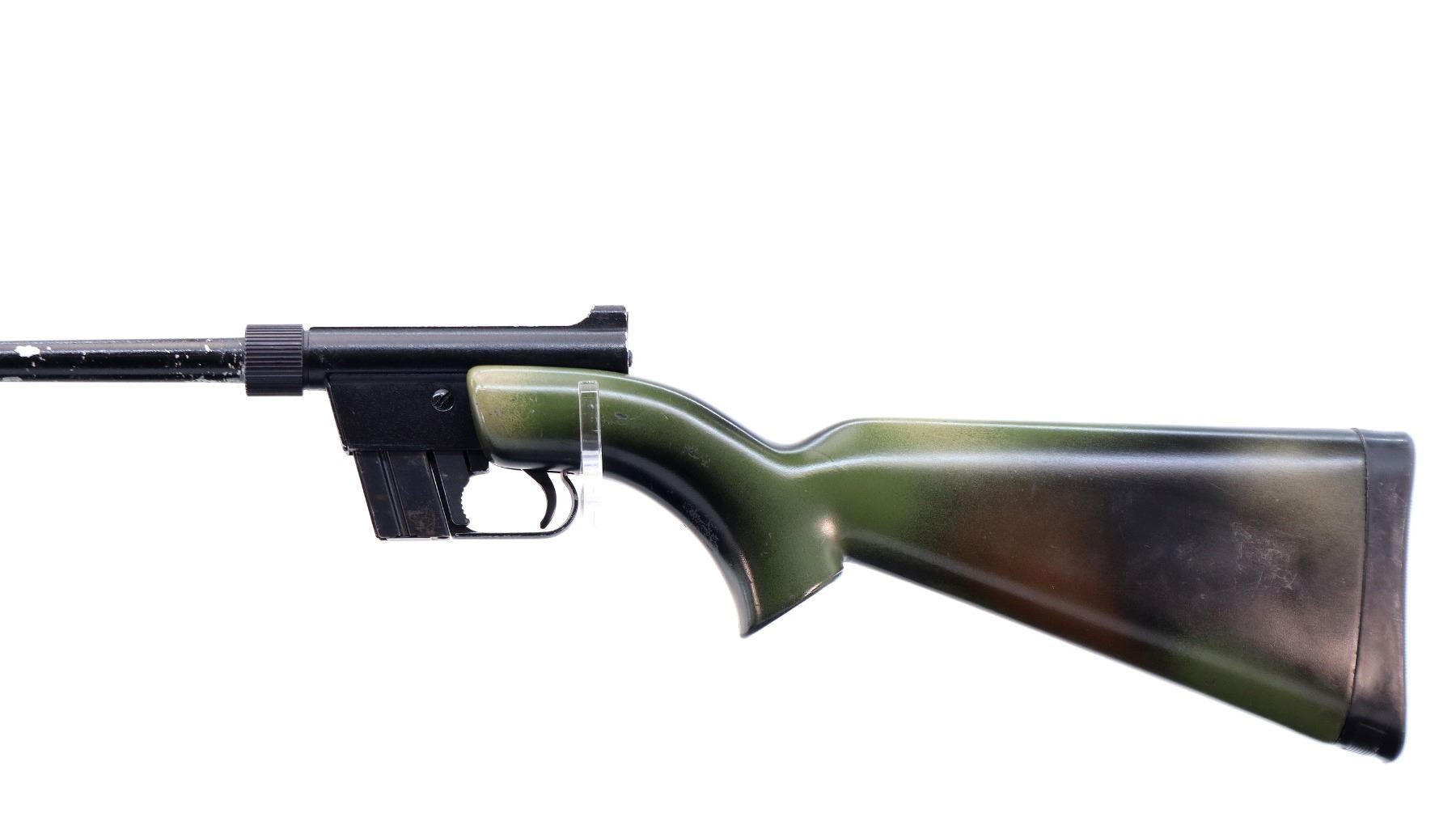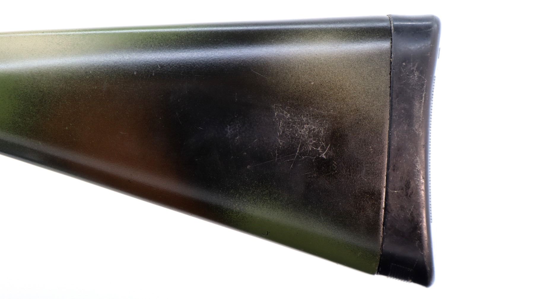 Main Description: Blade front sight with ramp, adjustable rear peep sight, black painted metal finish, grooved receiver. One piece Camo painted synthetic stock, pistol grip, grooved black polymer butt plate, rifle disassembles and stores in the stock. Spare parts include: Hammer, sear, ect.