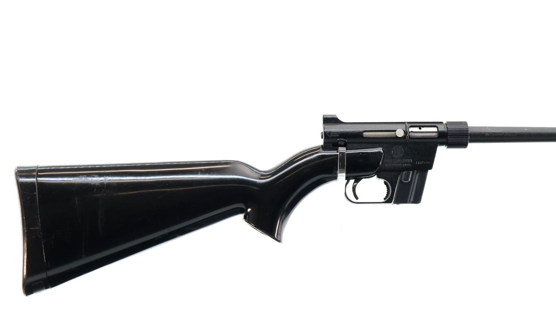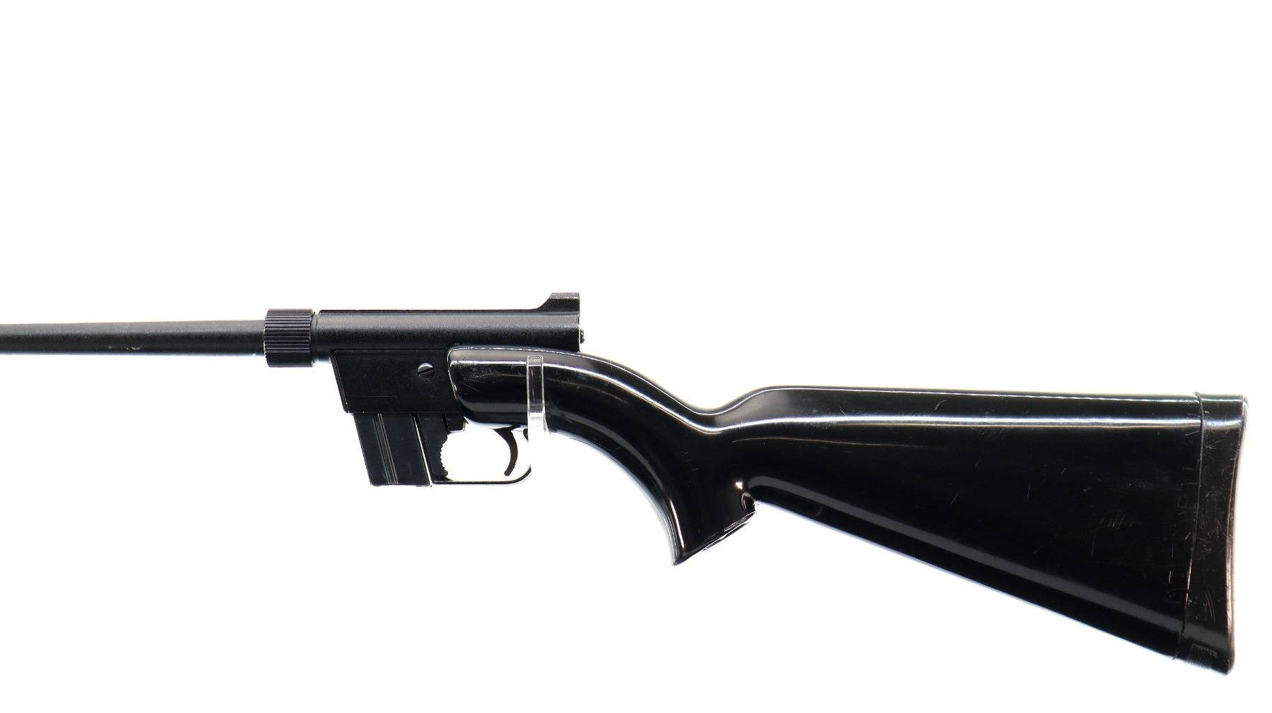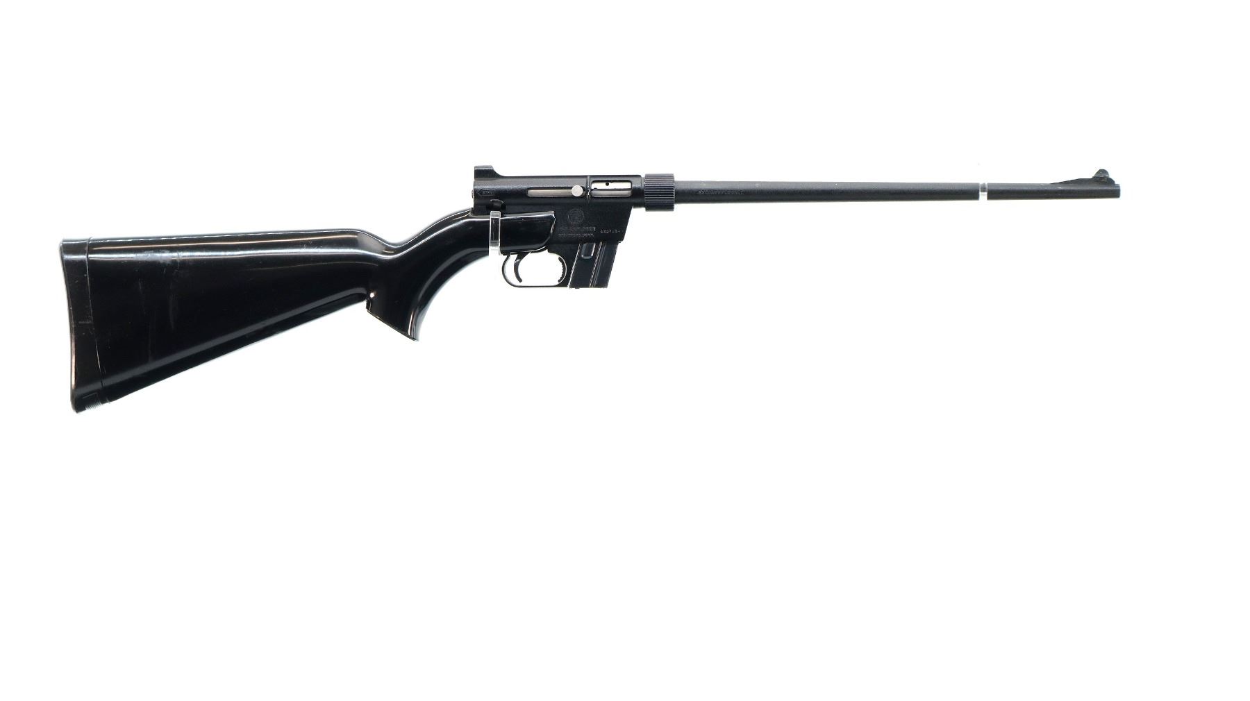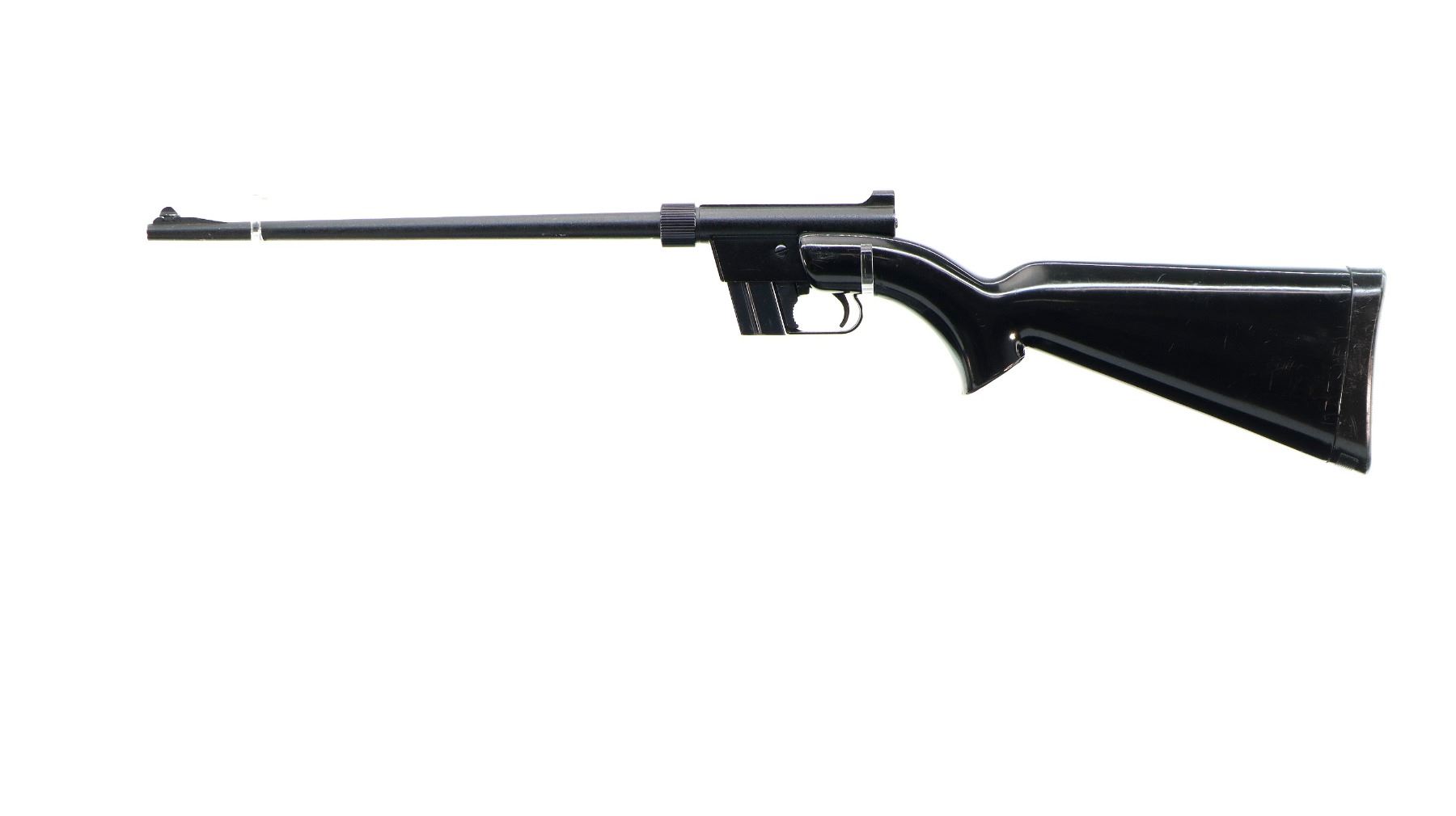Main Description: Blade fronts sight with ramp, adjustable rear peep sight, black painted metal finish. One piece black synthetic stock, pistol grip, grooved butt plate, rifle takes down and stores in the stock.