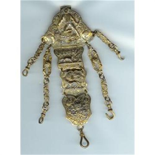 A French Chatelaine Circa 1875.Silver with gold wash. No marks. Depicting a man and gunpowder kegs on the top link, a cat and foliage on the second link, a dog or fox on the third link and a bouquet on the fourth. 5 chains for attachments, ending in screw top hooks one of which is half missing.