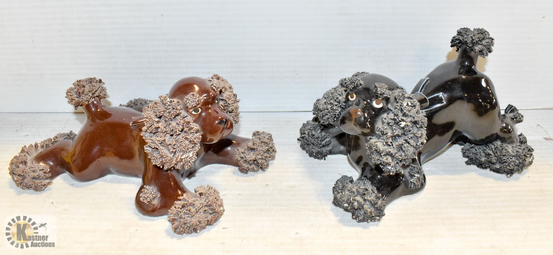 CHAULKWARE SPANIELS DOGS, ONE BROWN, ONE BLACK,