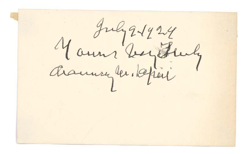 CHAUNCEY M. DEPEW (1834-1928). Railroad executive; Political figure. A lawyer, Depew worked extensively for the Vanderbilt railroad. Signed card “July 9, 1924. Yours very truly, Chauncey M. Depew”. 5” x 3 1/4”. July 9, 1924 Mounting trace on verso. Fine.