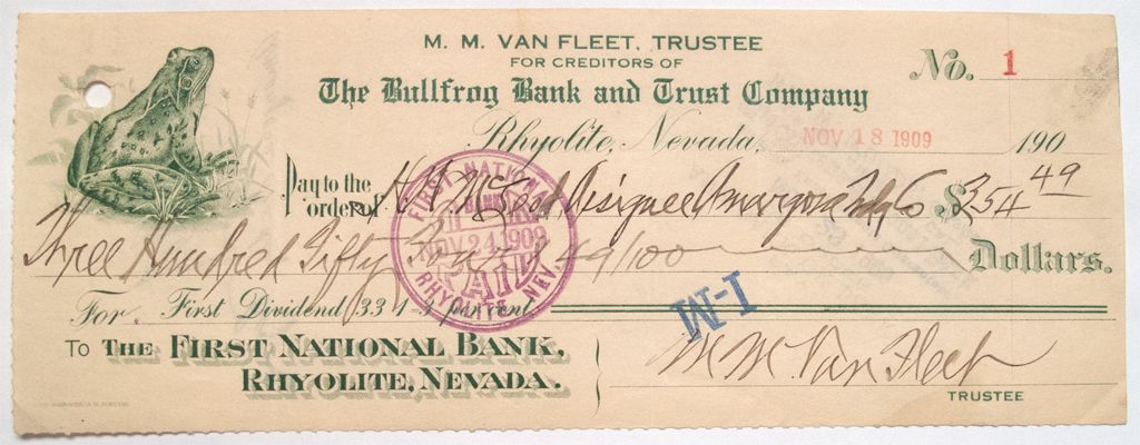 CHECK #1 for M. M. Van Fleet drawn on the Bullfrog Bank and Trust Company