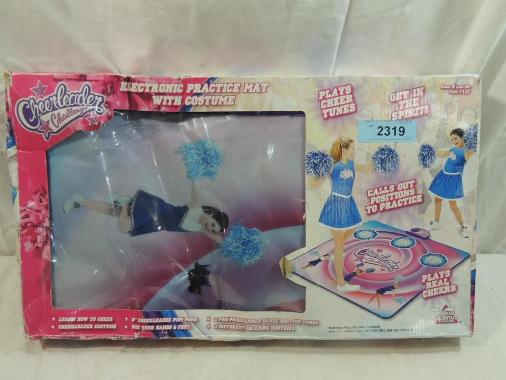 ELECTRONIC PRACTICE MAT WITH COSTUME, PLAYS CHEER TUNES, GET IN THE SPIRIT, CALLS OUT POSITIONS TO PRACTICE, PLAYS REAL CHEERS, NEW IN BOX AS SHOWN SEE PHOTO FOR MORE DETAILS.