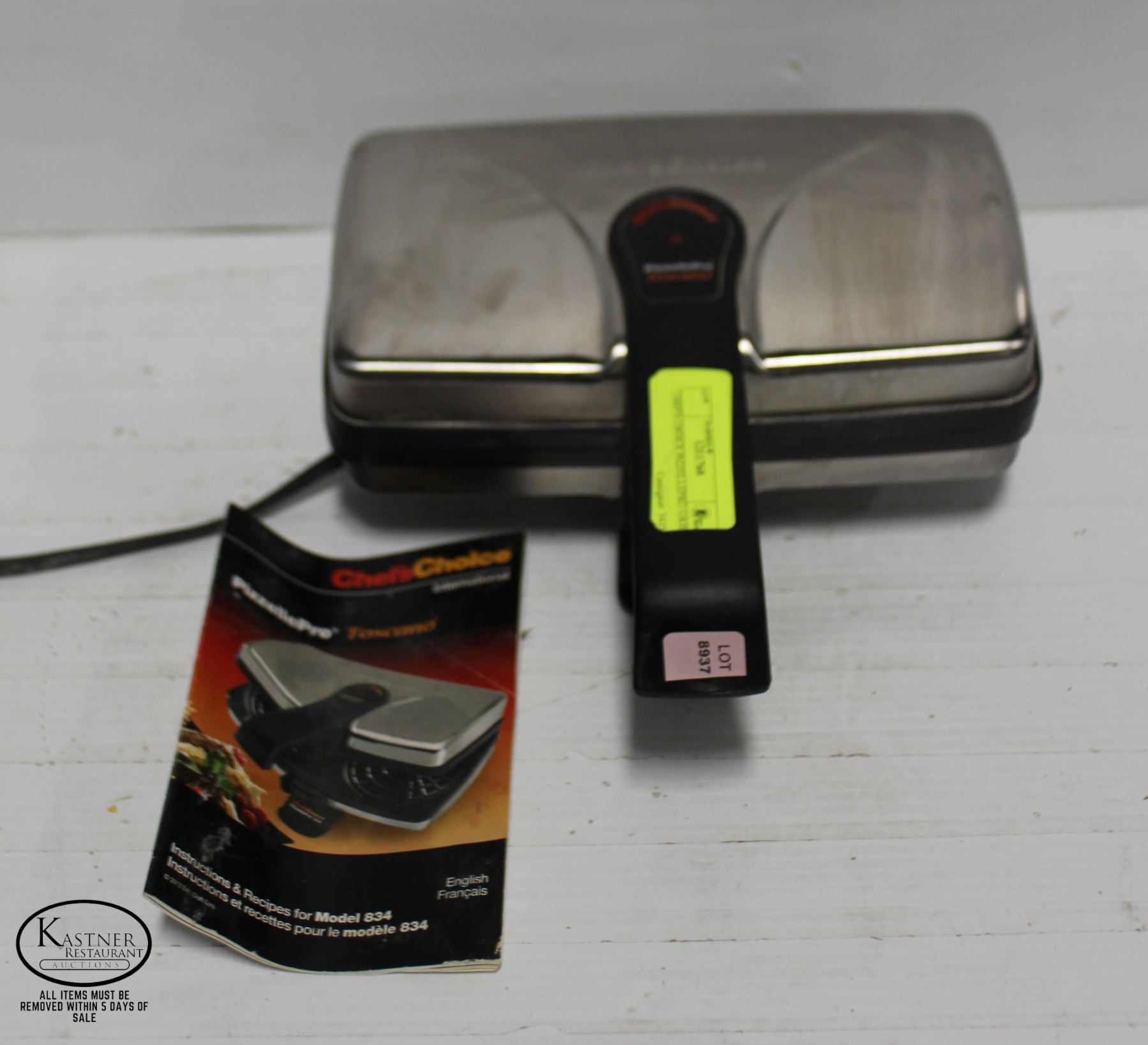 PROFESSIONAL GRILL FOR PIZELLES, MAKES TWO 4.5" PIZZELLES. M3 834, 900W, 120V, W/ MANUAL. NON-STICK COATING **ALL ITEMS MUST BE REMOVED BY 5PM MONDAY, JULY 3RD, 2023. ALL REMAINING ITEMS WILL BE SUBJECT TO A $6.00 PER DAY STORAGE CHARGE. ANY ITEMS REMAINING AFTER MONDAY, JULY 17TH, 2023 WILL BE CONSIDERED FORFEITED. NO REFUNDS WILL BE ISSUED FOR FORFEITED ITEMS.** TO SCHEDULE A PICK UP APPOINTMENT CLICK HERE