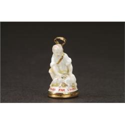 CHELSEA MINIATURE SEAL FIGURE OF A SHEPHERD, modelled and painted in colours and gilt, the kneeling figure