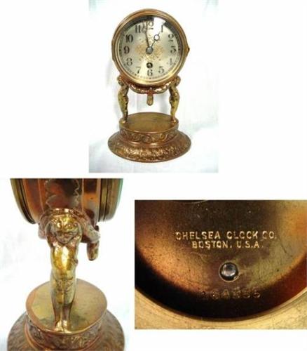 CHELSEA NEVELTY TABLE CLOCK TIME ONLY SERIAL 16355. BRASS CAST BODY; MOVEMENT SUPPORTED BY TWO CHERUBS; CIRCA 1920'S-30'S. 7.5"X5"X4". VALUATION: 650-750 USD.