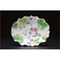 CHELSEA OVAL DISH,, moulded with fruiting vines painted in colours around a bouquet of garden f...