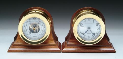 CHELSEA SHIPS BELL CLOCK WITH MATCHING BAROMETER. Both housed in wood stands, round brass clock and barometer. Clock marked "Shreve, Crump and Low Co., Boston". Serial number on back of clock 819678. Comes with key and instruction booklet. Serial number on back is of barometer is 279 3. SIZE: 4-3/4in. across front brass cover. Overall is 6-1/2in. h x 8in. w x 4in. d. CONDITION: Very good. 9-26321