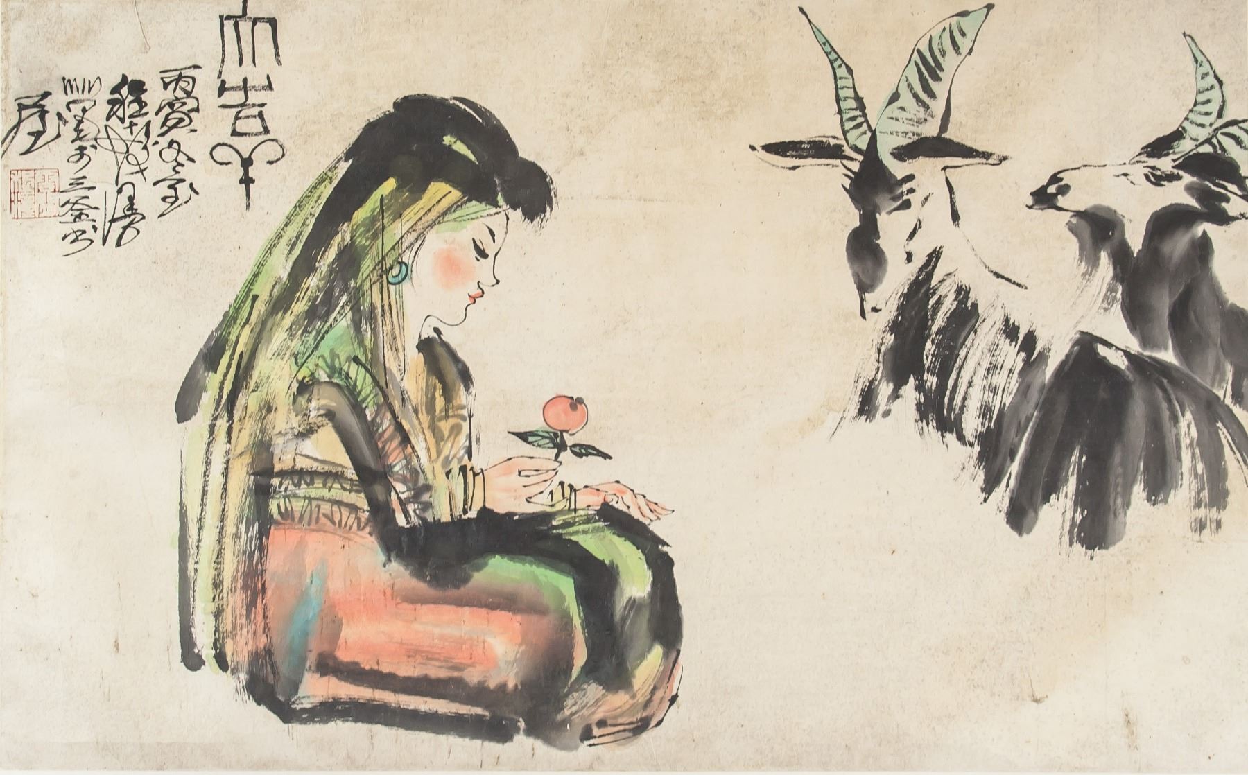 Ink and watercolor on paper, hanging scroll, featuring seated girl with two goats, signed and attr. Cheng Shifa (1921-2007, Chinese), inscribed with 1 artist seal; 46 cm x 73 cm, Cheng Shifa was a Chinese painter best known for his works depicting figures, landscapes, and flowers. His eclectic style merged traditional Chinese wash techniques with Western drawing aesthetics. Today, his works are held in the collections of the China Art Museum in Shanghai and the Metropolitan Museum of Art in New York.