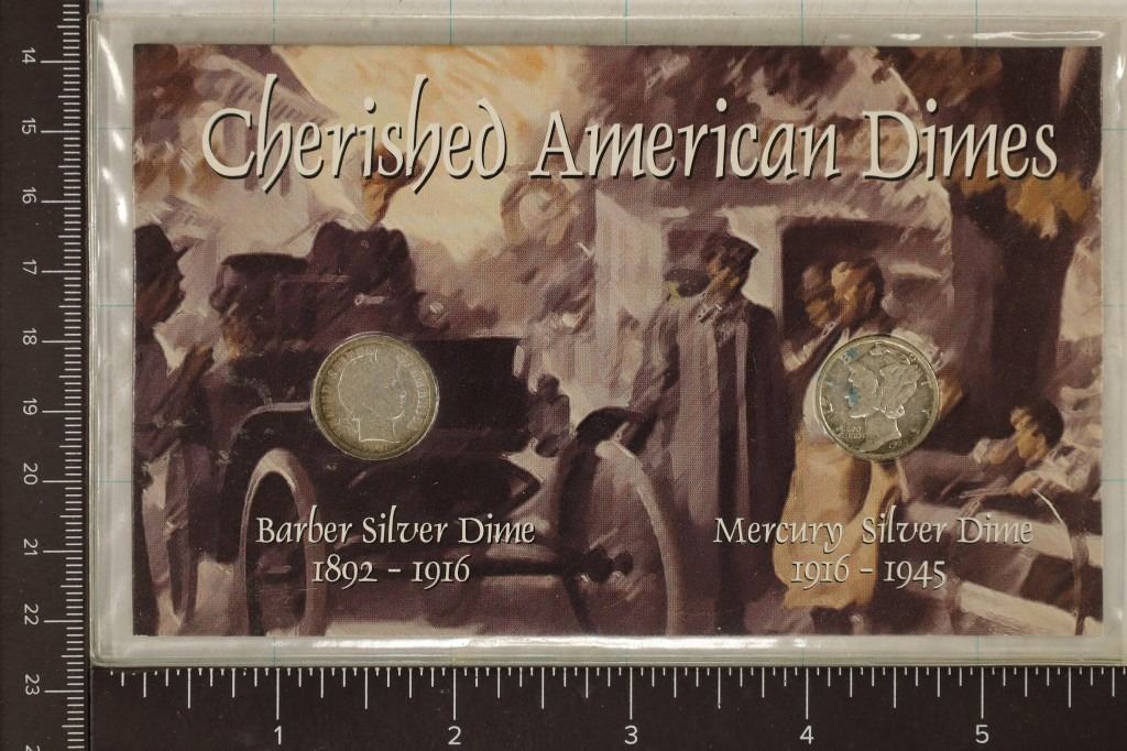 BARBER DIME AND 1942 SILVER MERCURY DIME IN CARDBOARD IN PLASTIC SLEEVE