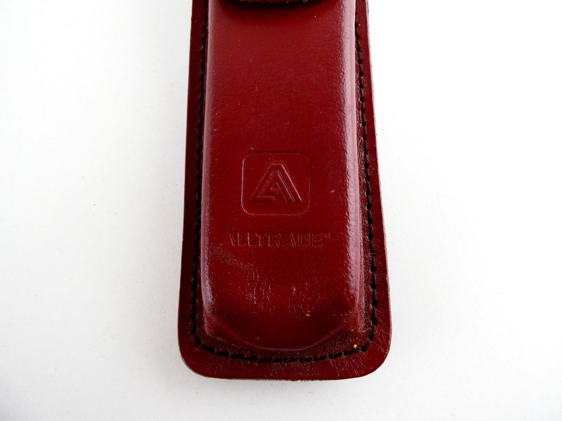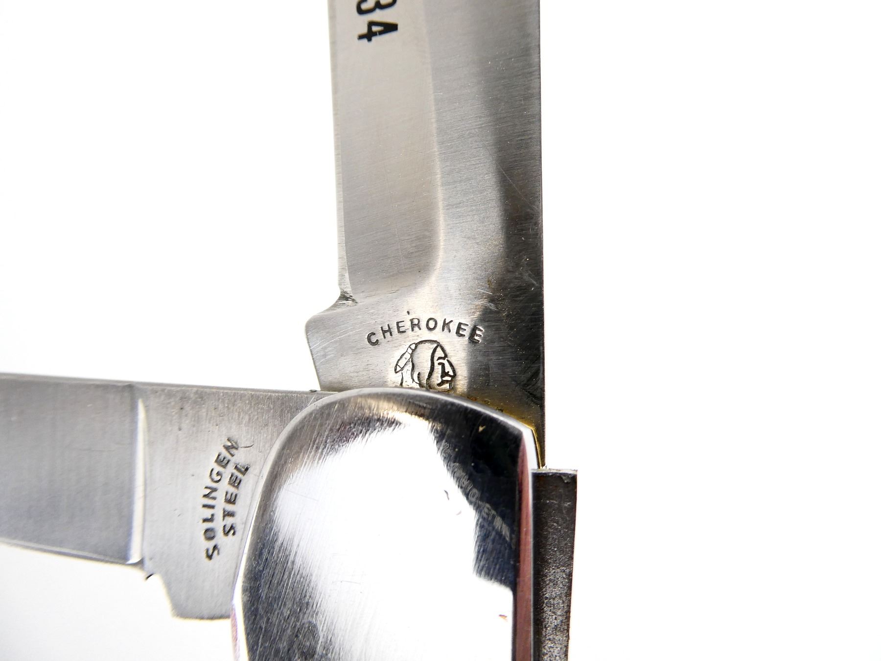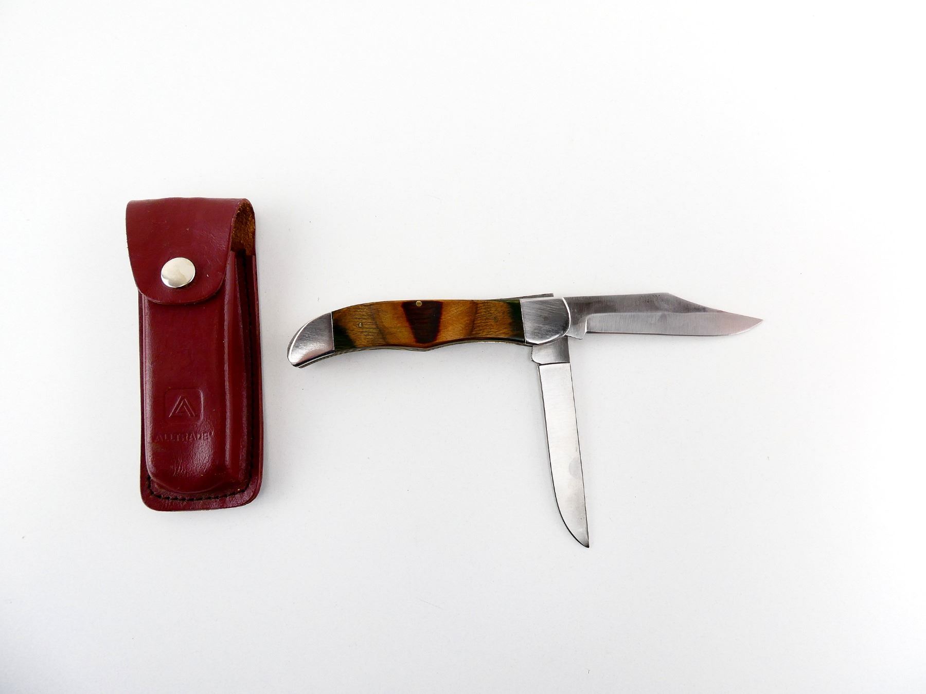 (1) 2 BLADES, STEEL BLADES, 1 BLADE MARKED "PREMIER H234", "CHEROKEE", ETC., 1 BLADE MARKED "SOLINGEN STEEL", WOODEN HANDLE, UNMARKED, SHOWS LIGHT WEAR & TEAR / USE MARKS, BLADE OVERALL LENGTH APPROX. 4.25", OVERALL LENGTH APPROX. 9.25", WITH LEATHER SHEATH MARKED "ALLTRADE". SEE PHOTOS.