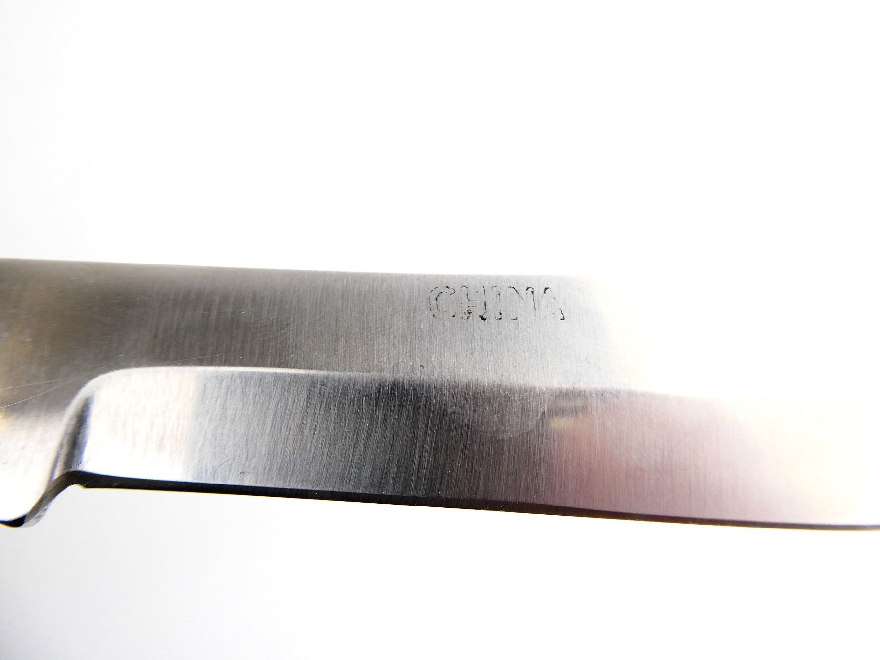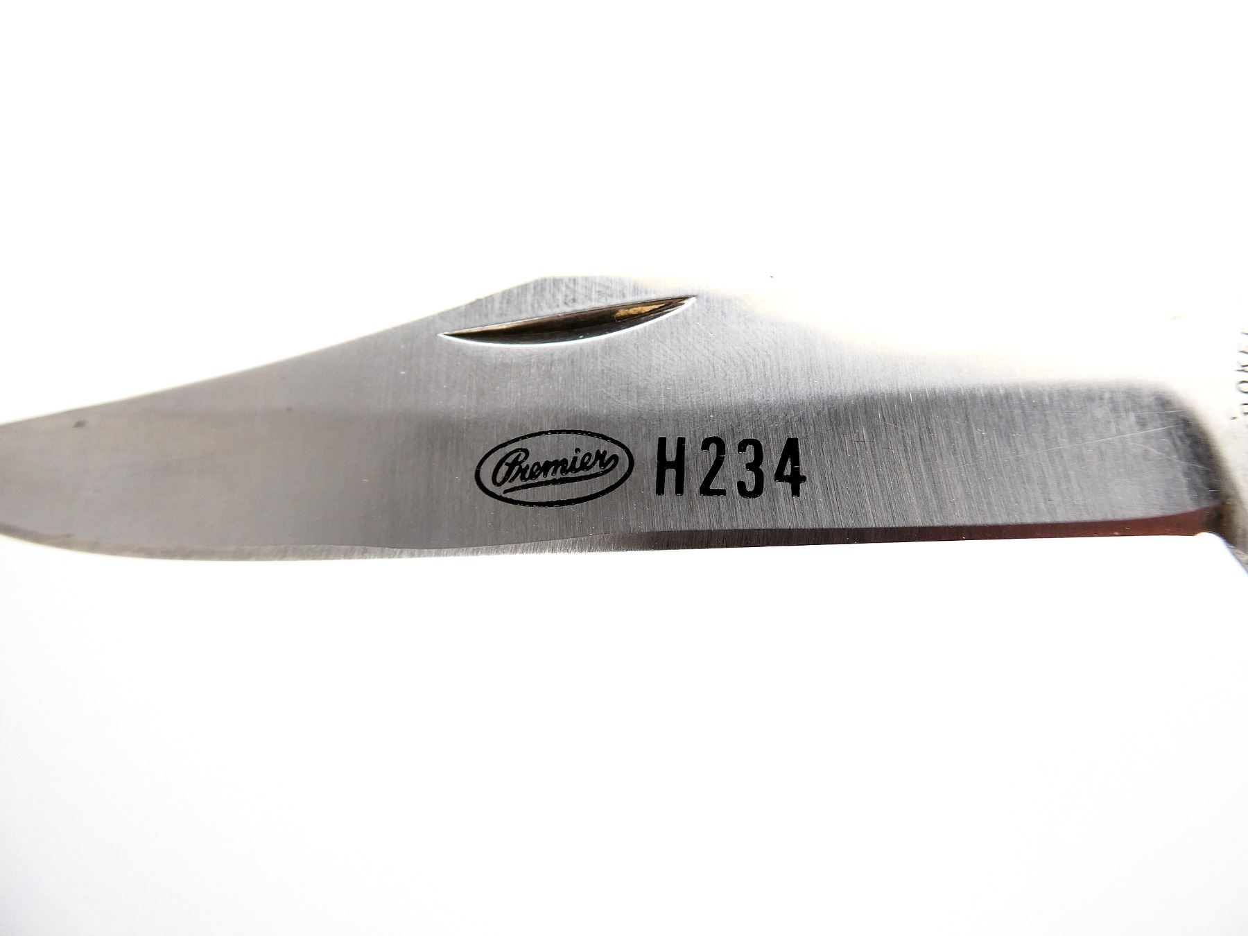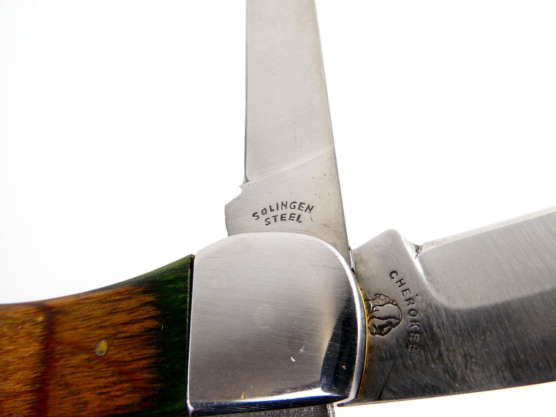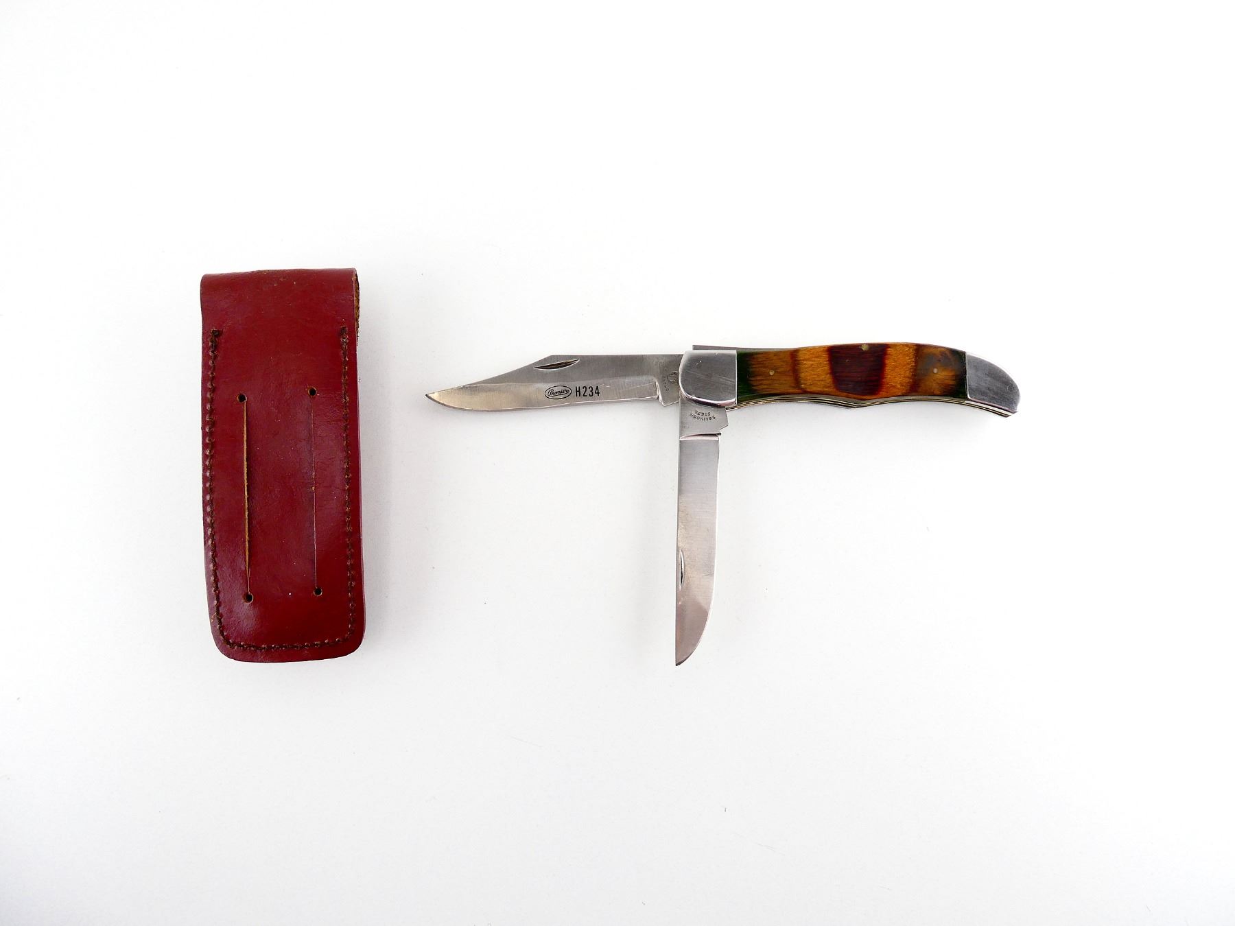 (1) 2 BLADES, STEEL BLADES, 1 BLADE MARKED "PREMIER H234", "CHEROKEE", ETC., 1 BLADE MARKED "SOLINGEN STEEL", WOODEN HANDLE, UNMARKED, SHOWS LIGHT WEAR & TEAR / USE MARKS, BLADE OVERALL LENGTH APPROX. 4.25", OVERALL LENGTH APPROX. 9.25", WITH LEATHER SHEATH MARKED "ALLTRADE". SEE PHOTOS.
