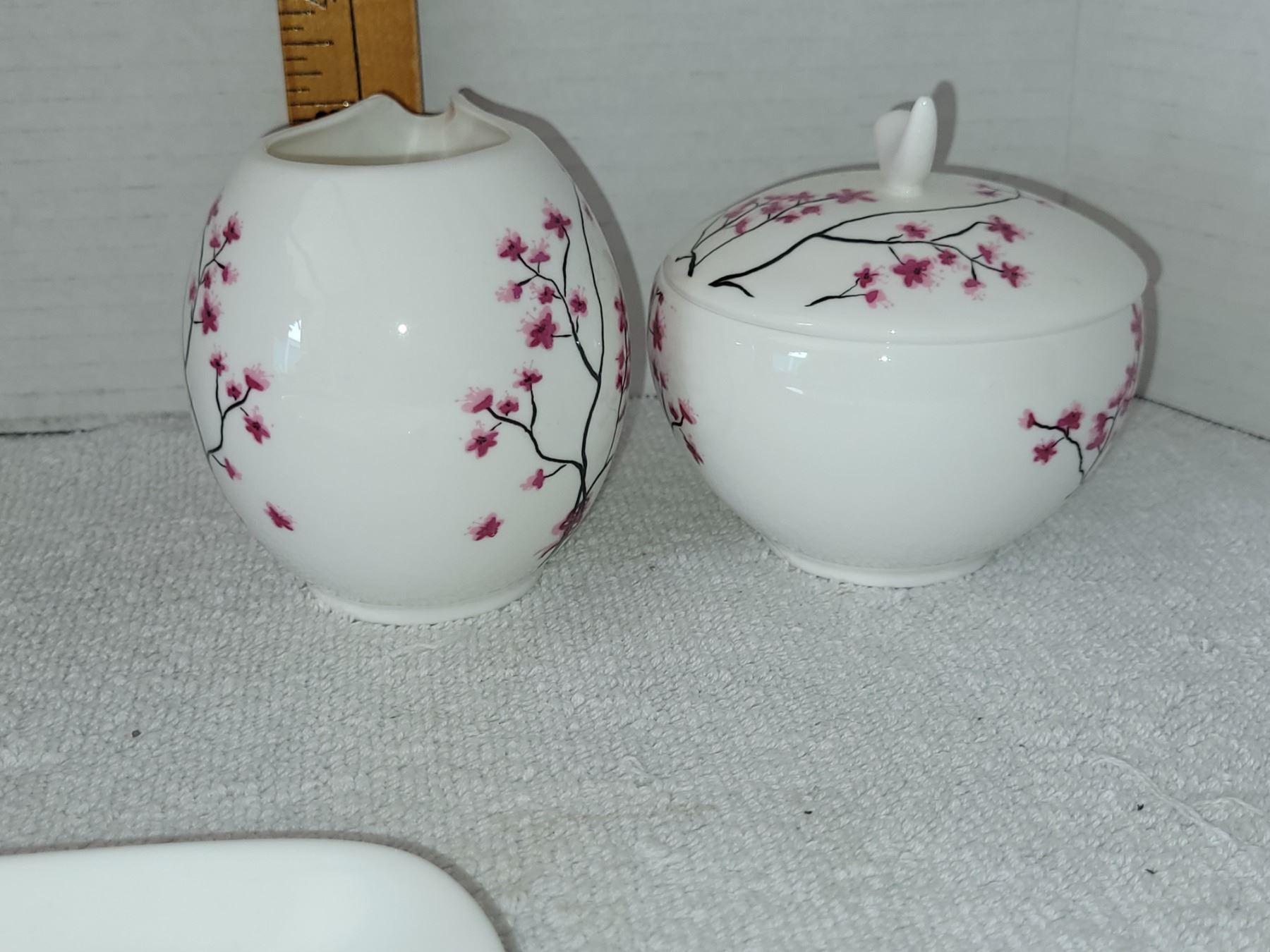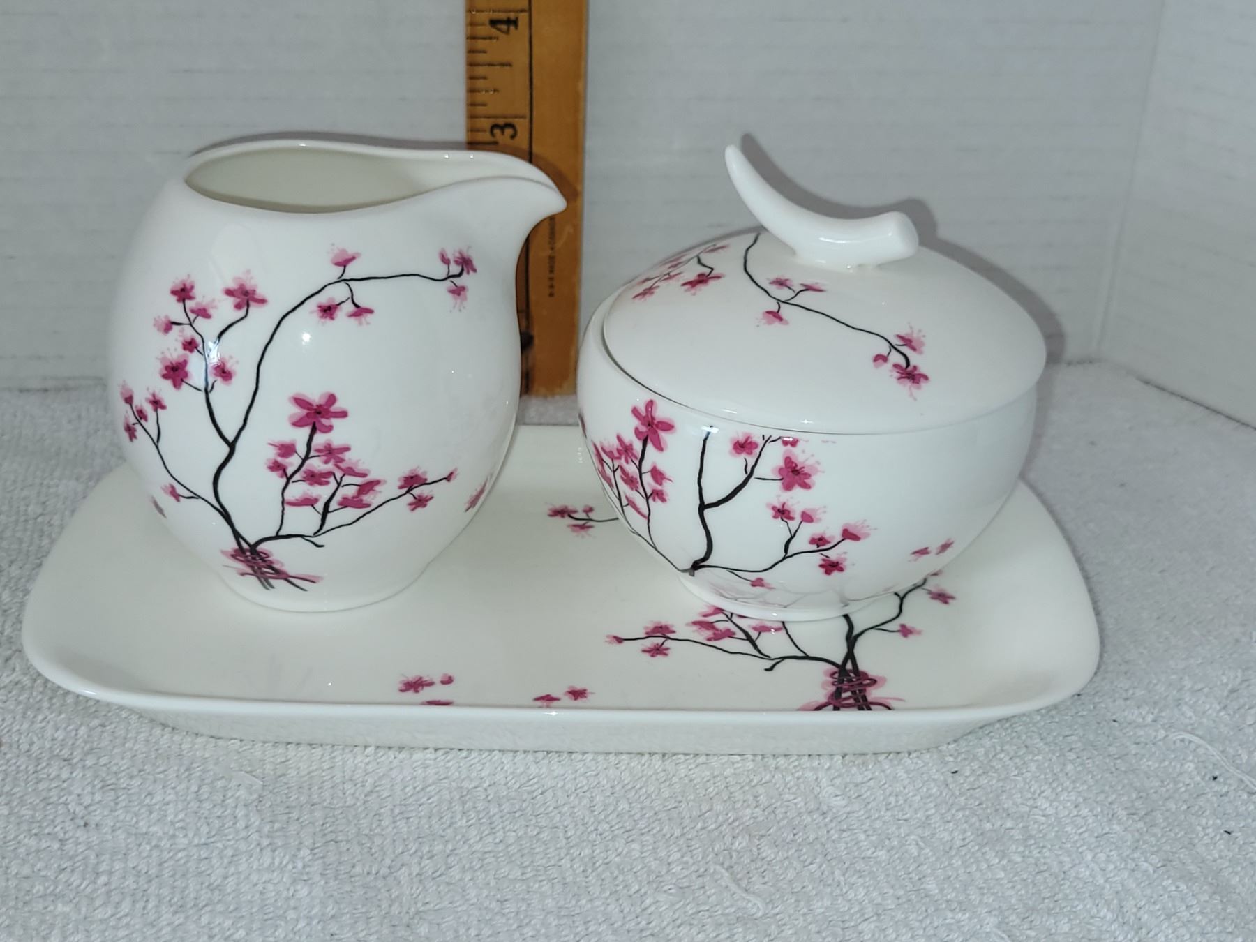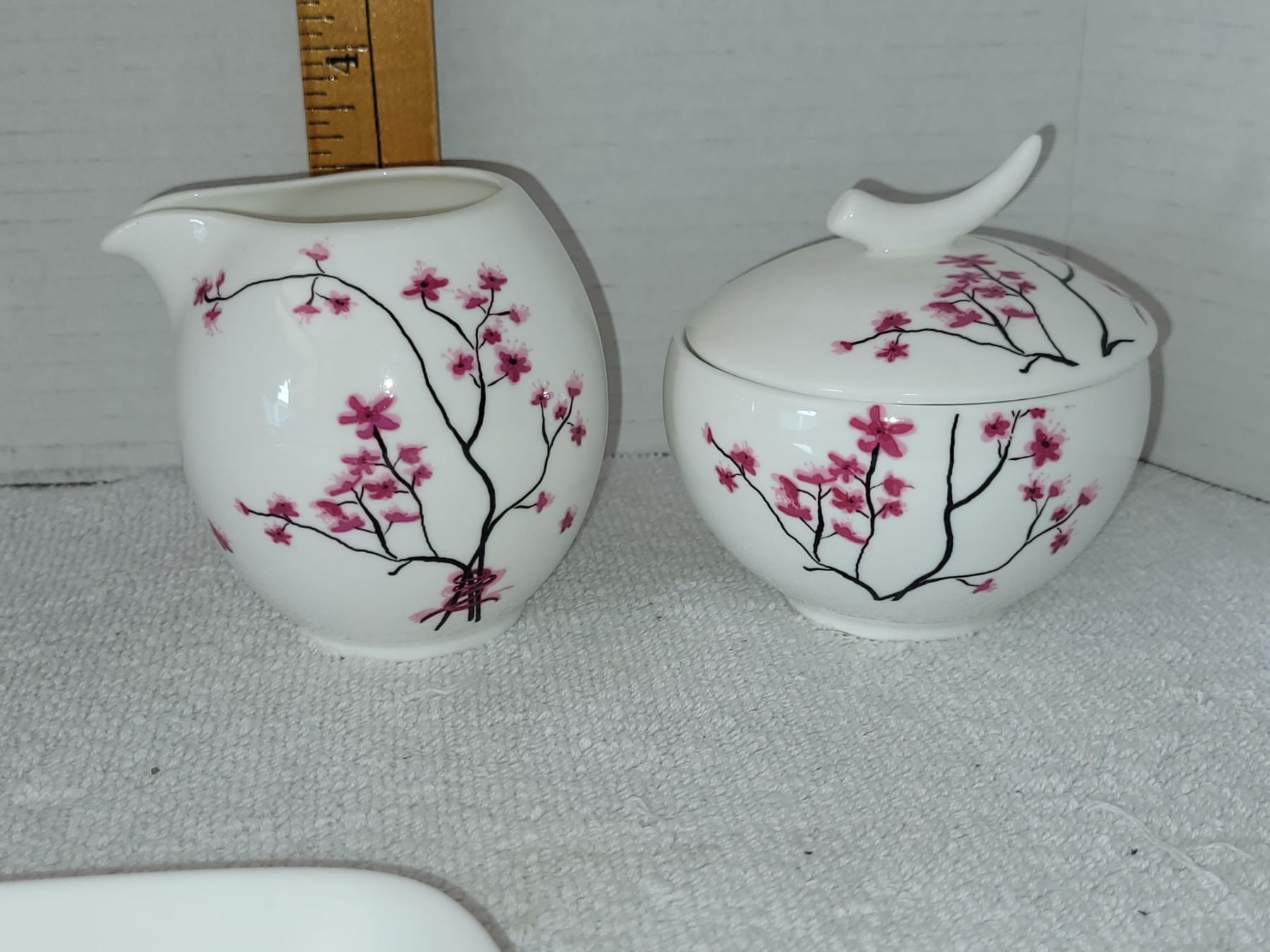 CHERRY BLOSSOM TEA LOGIC CREAMER, LIDDED SUGAR BOWL & UNDERPLATE. CREAMER MEASURES 3.5" X 4"; SUGAR BOWL MEASURES 3.25" X 4"; UNDERPLATE MEASURES 8" X 4"