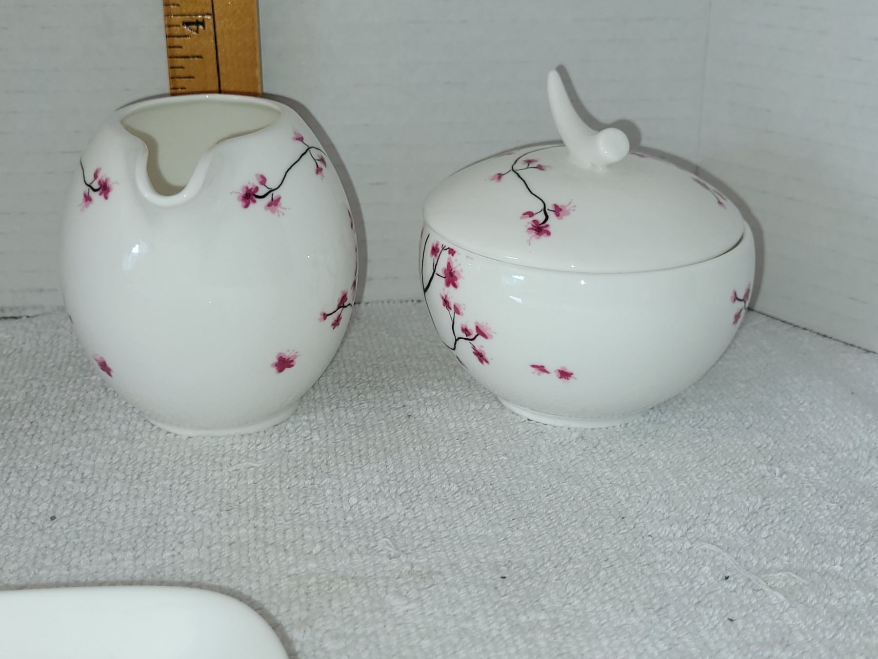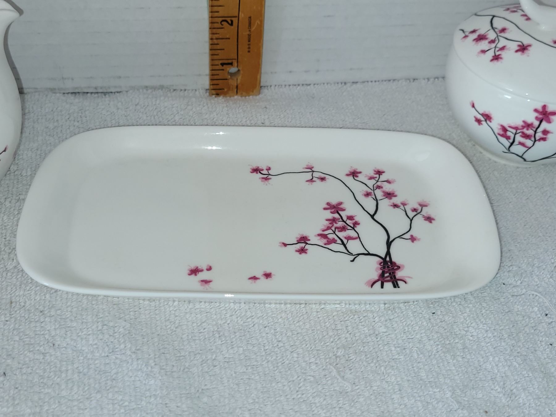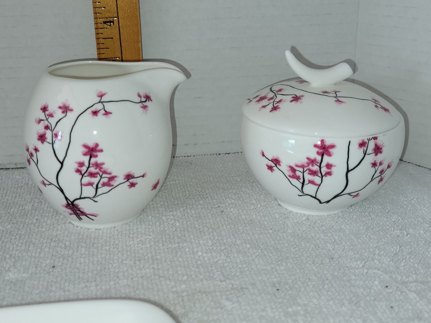 CHERRY BLOSSOM TEA LOGIC CREAMER, LIDDED SUGAR BOWL & UNDERPLATE. CREAMER MEASURES 3.5" X 4"; SUGAR BOWL MEASURES 3.25" X 4"; UNDERPLATE MEASURES 8" X 4"