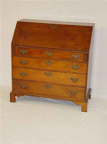 CHERRY CHIPPENDALE SLANT FRONT DESK W/ FITTED 7 DRAWER INTERIOR, 4 GRADUATED DRAWERS ON A BRACKET BASE - REFINISHED, IMPERFECTIONS;