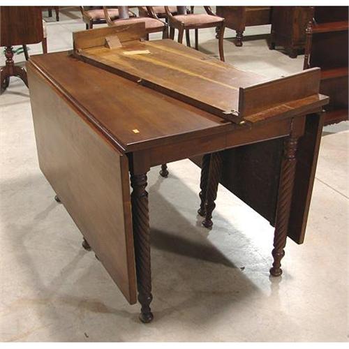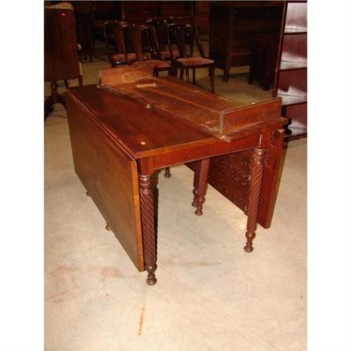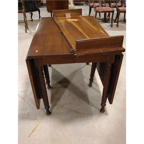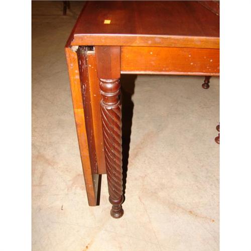 CHERRY DROP-LEAF TABLE. Made the Youngsville Star Manufacturing Company, Youngsville, Penn. Twisted legs with leaf. 29” H, 44” L, 28.5” W. Each drop-leaf: 21.5” W. Leaf: 15” W.