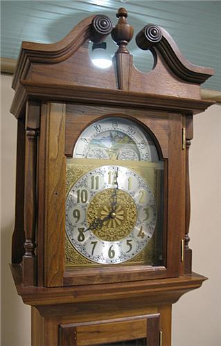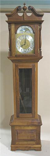 CABINETMAKER CHERRY GRANDFATHER CLOCK. With German clock works. Broken arch top with single center finial. Single columns at both sides of hood. Knob at hood door is missing as well as knob at middle door. With weights and pendulum. 82” H, 17.5” W