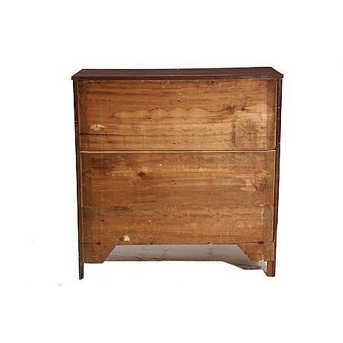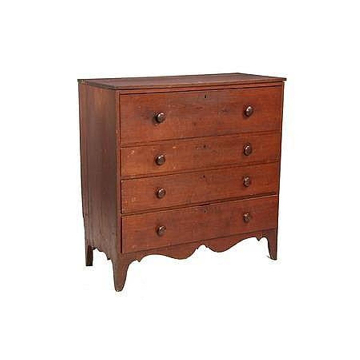 CHEST OF DRAWERS - Ca 1790, country Hepplewhite cherry chest of drawers. Four drawers with oversized top drawer and three graduated lower drawers with turned mushroom pulls, shaped apron on French foot. 43in high, 42 1/4in wide, 19 1/4in deep