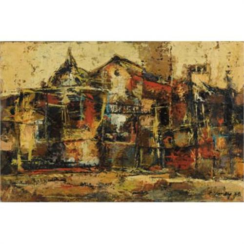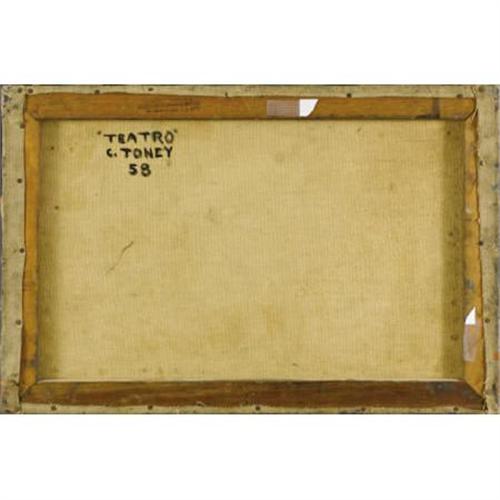 <B>CHESTER TONEY (1935-1965)</B></I><BR><I>Teatro</B></I>, 1958<BR>Oil on canvas<BR>16 x 24 inches (40.6 x 61.0 cm)<BR>Signed and dated lower right<BR>Signed, dated, and titled verso<BR><BR> <B>Condition Report:</B> Excellent condition. Painting would benefit from a light surface cleaning. Unframed.<BR><BR><b>Shipping:</b> Requires 3rd Party Shipping (<a target="_blank" href="http://www.heritageauctions.com/common/shipping.php">view shipping information</a>)