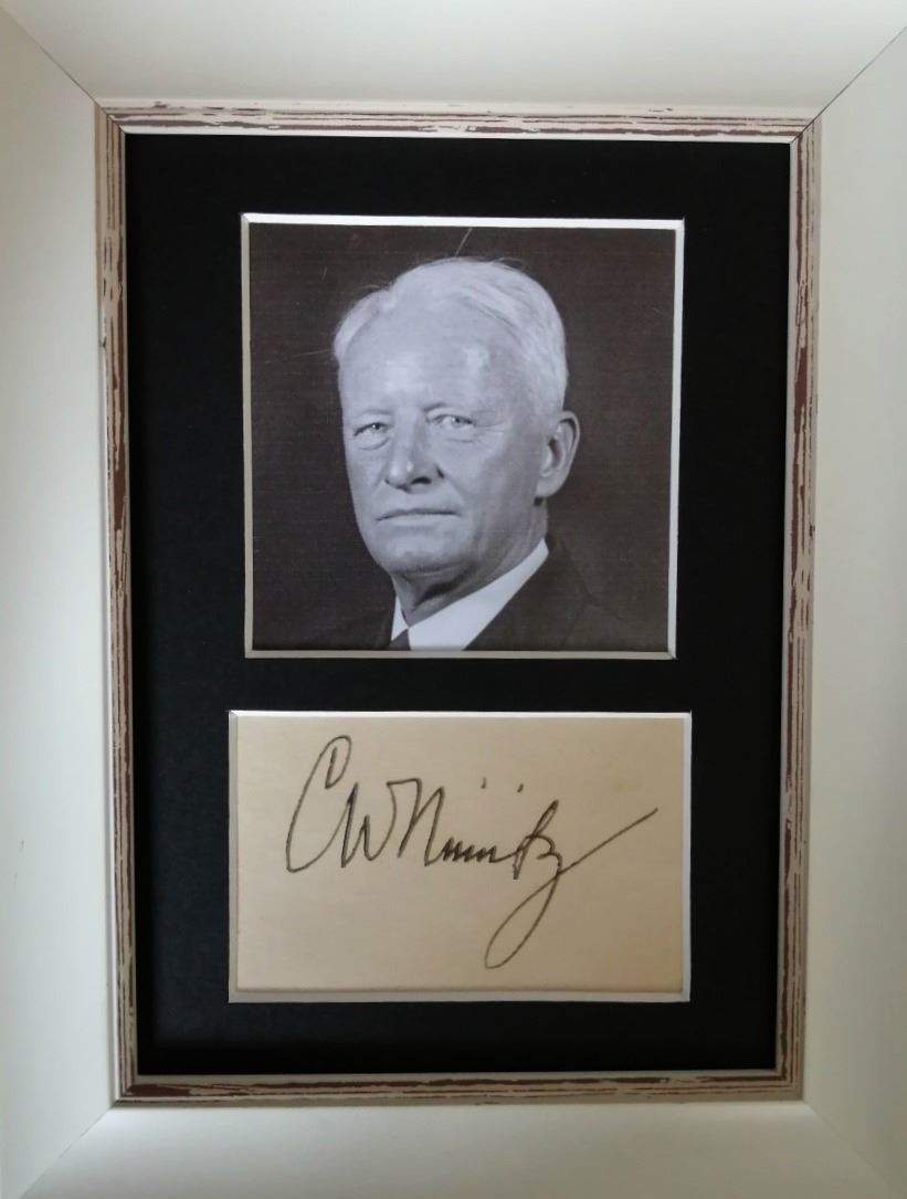 Chester William Nimitz, Sr. was a fleet admiral of the United States Navy. He played a major role in the naval history of World War II as Commander in Chief, U.S. Pacific Fleet and Commander in Chief, Pacific Ocean Areas, commanding Allied air, land, and sea forces during World War II.