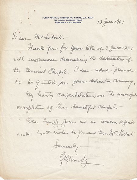 (1885 - 1966) American admiral, Commander in Chief of the U.S. Pacific Fleet during World War II and largely responsible for the successful "island-hopping" campaign against the Japanese. A.L.S. "C. W. Nimitz", 1p. 4to., Berkeley, CA, June 13, 1961. In part: "...Thank you for your letter of 8 June 1961 with enclosures describing the decication of the Memorial Chapel. I am - indeed - pleased to be quoted in your dedication ceremony. My hearty congratulations on the successful completion of this beautiful chapel......". Minor toning at margins, else very good.