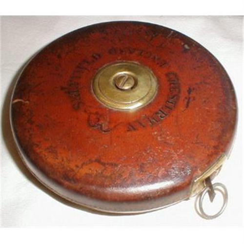 This is a wonderful item....would make a great gift for the "Handyman"!! A late 1800's, 100' steel tape in a leather bound case with brass fittings that was made by and is signed, CHESTERMAN SHEFFIELD ENGLAND. Beautiful workmanship in this surveyors' instrument which is in very good condition but does have a very old "make-do" repair at the 3'4" mark. Repair does not impede winding and unwinding however.