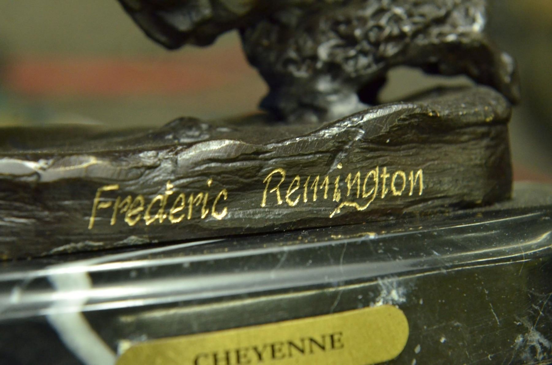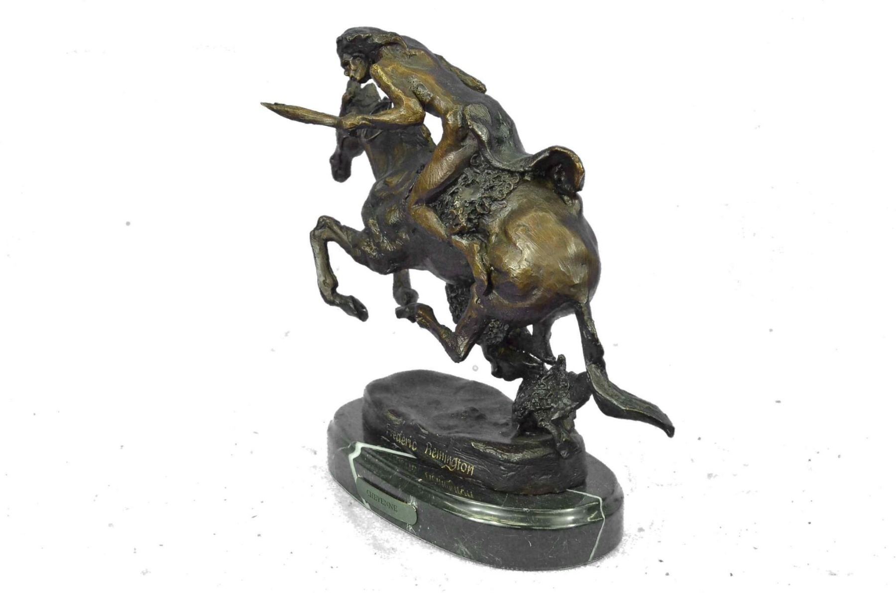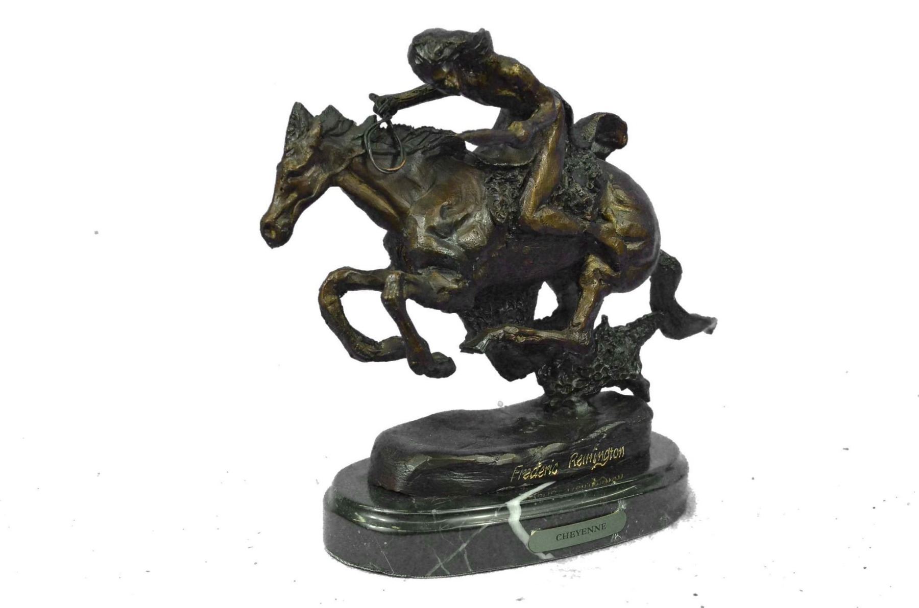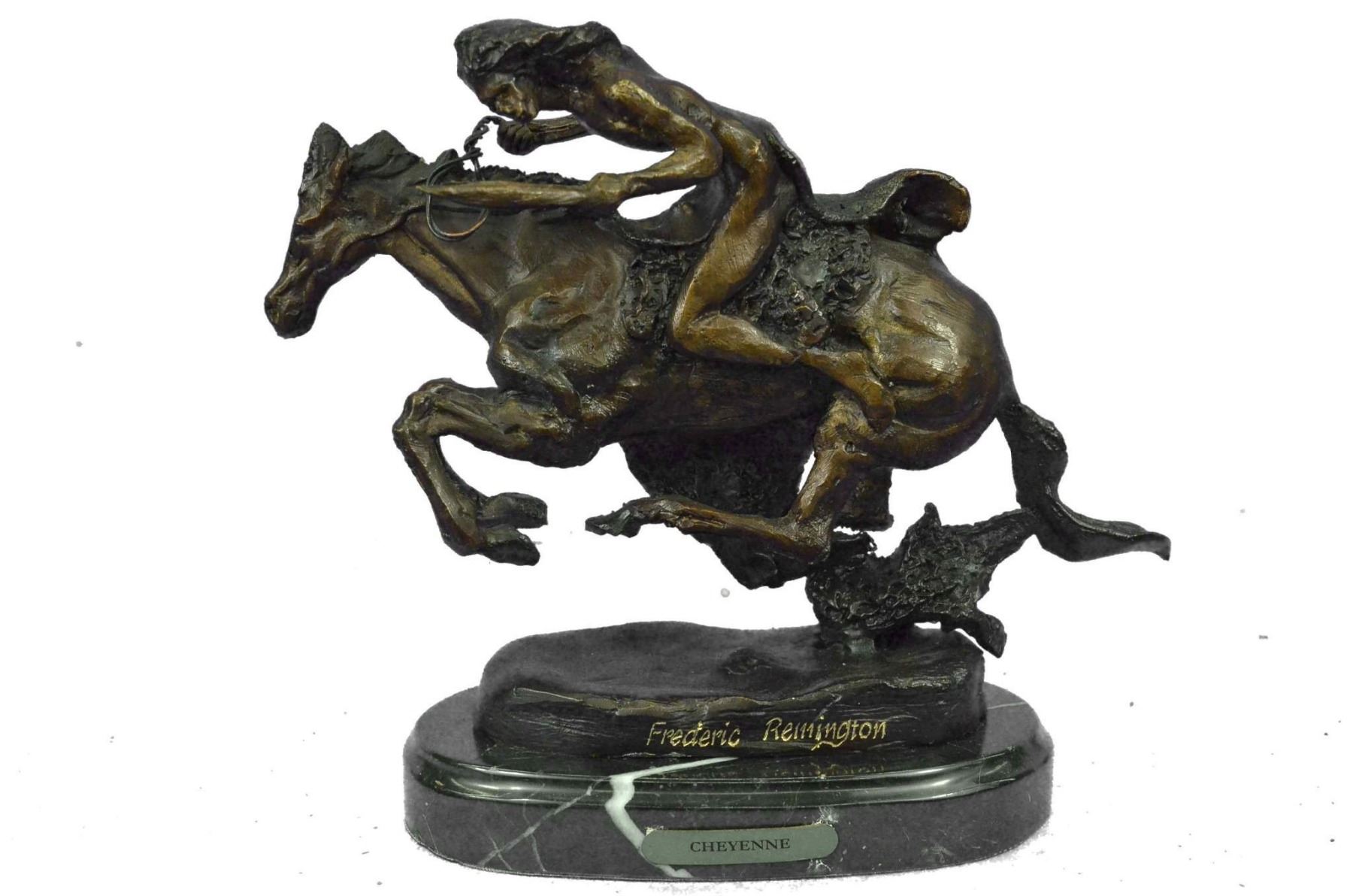 This sculpture is 100% hot cast bronze metal and was handmade by artists using the ancient lost wax casting process.  This sculpture contains no resins or cheap fillers. This sculpture is mounted on a real marble base. Condition: New Bronze Dimensions with Marble Base:Height 8 x Width 10" Marble Dimensions: 7" Diameter Height without base: 7" Approximate Weight : 7 LBS Signature: Frederic Remington Original or Reproduction: Reproduction