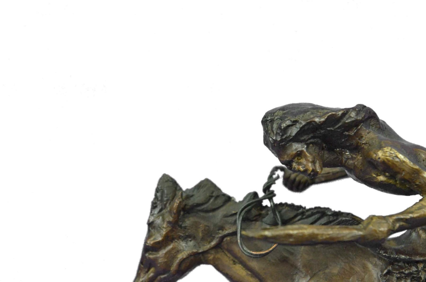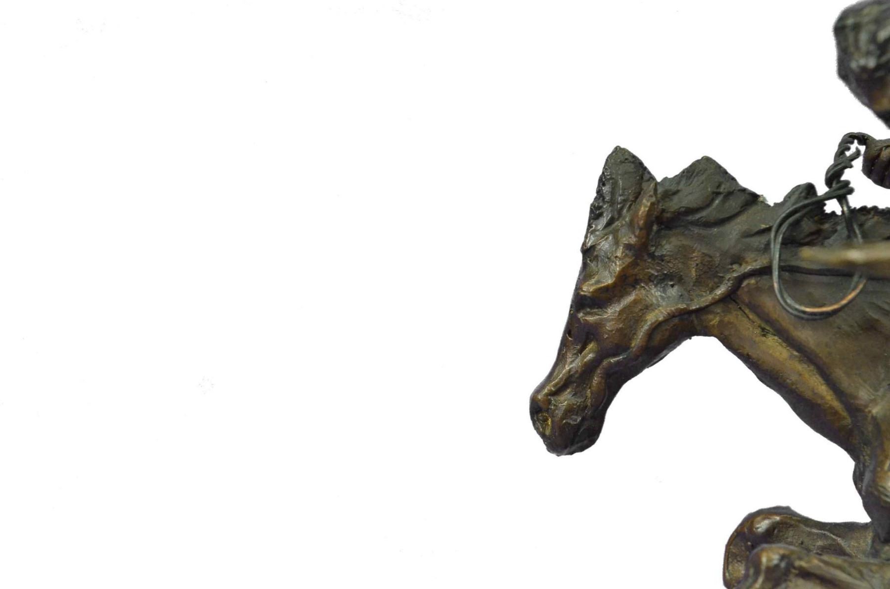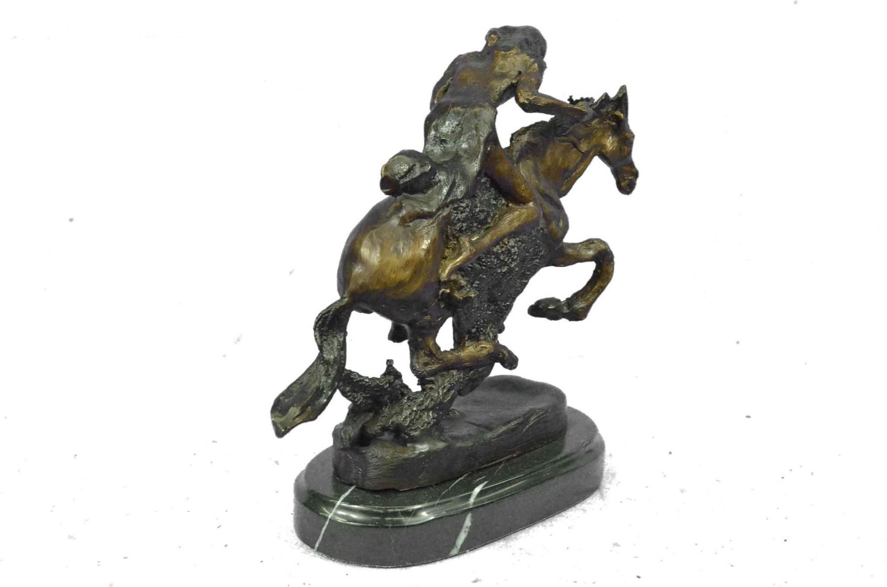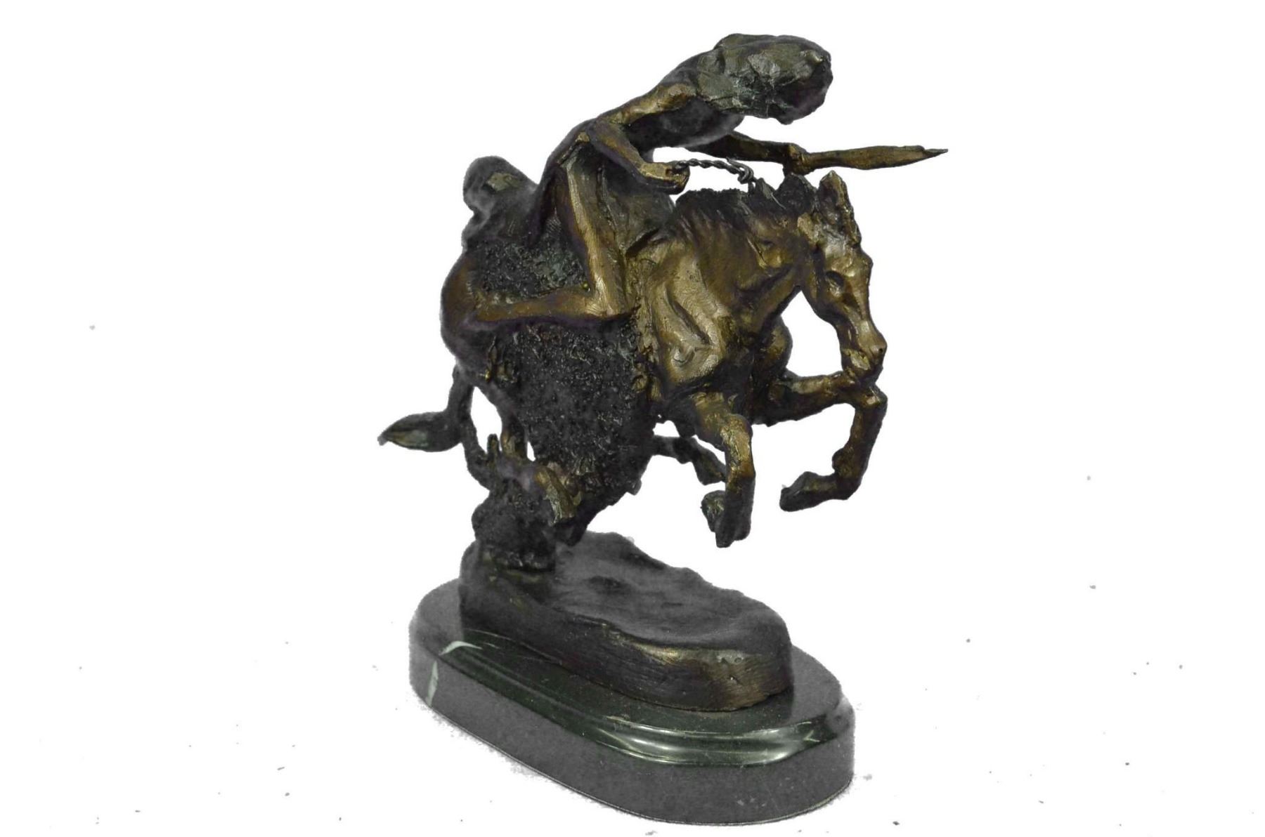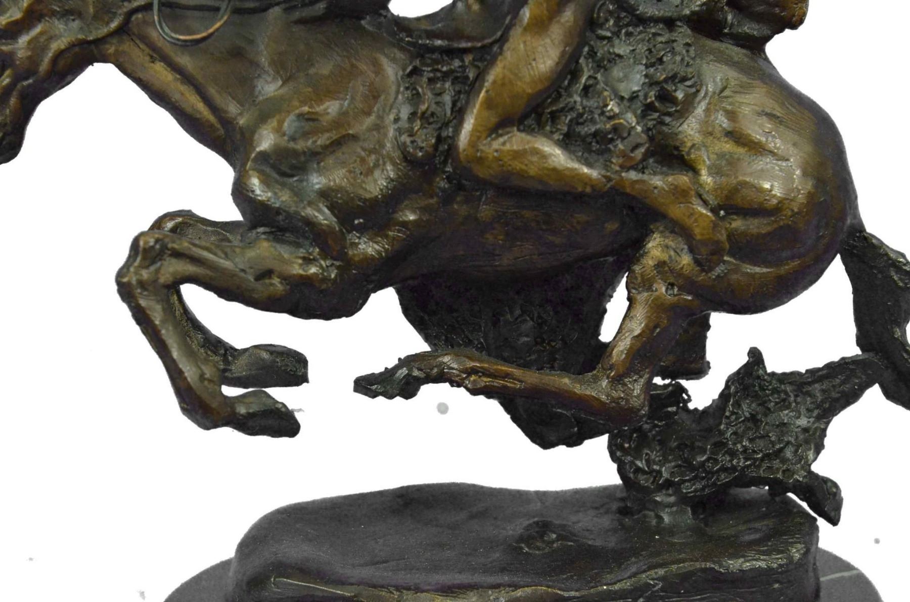 This sculpture is 100% hot cast bronze metal and was handmade by artists using the ancient lost wax casting process.  This sculpture contains no resins or cheap fillers. This sculpture is mounted on a real marble base. Condition: New Bronze Dimensions with Marble Base:Height 8 x Width 10" Marble Dimensions: 7" Diameter Height without base: 7" Approximate Weight : 7 LBS Signature: Frederic Remington Original or Reproduction: Reproduction