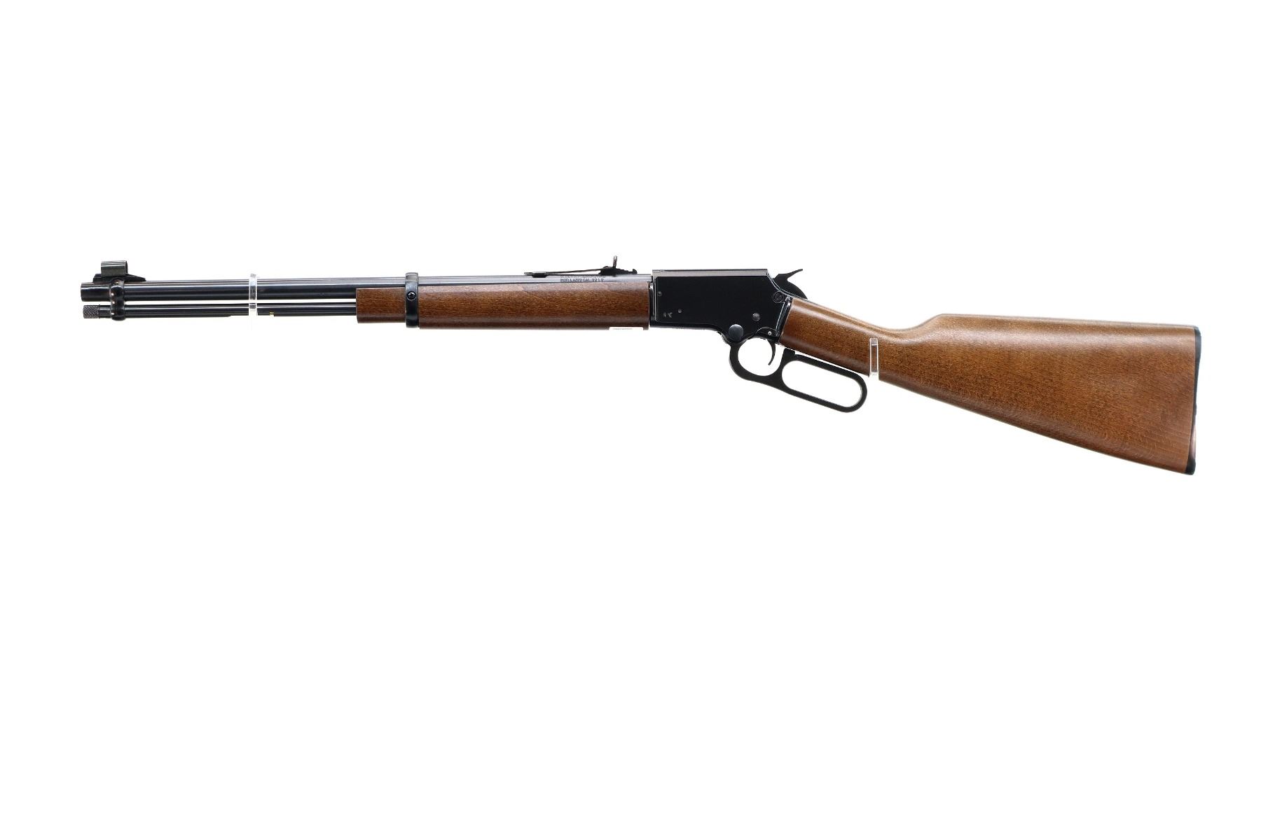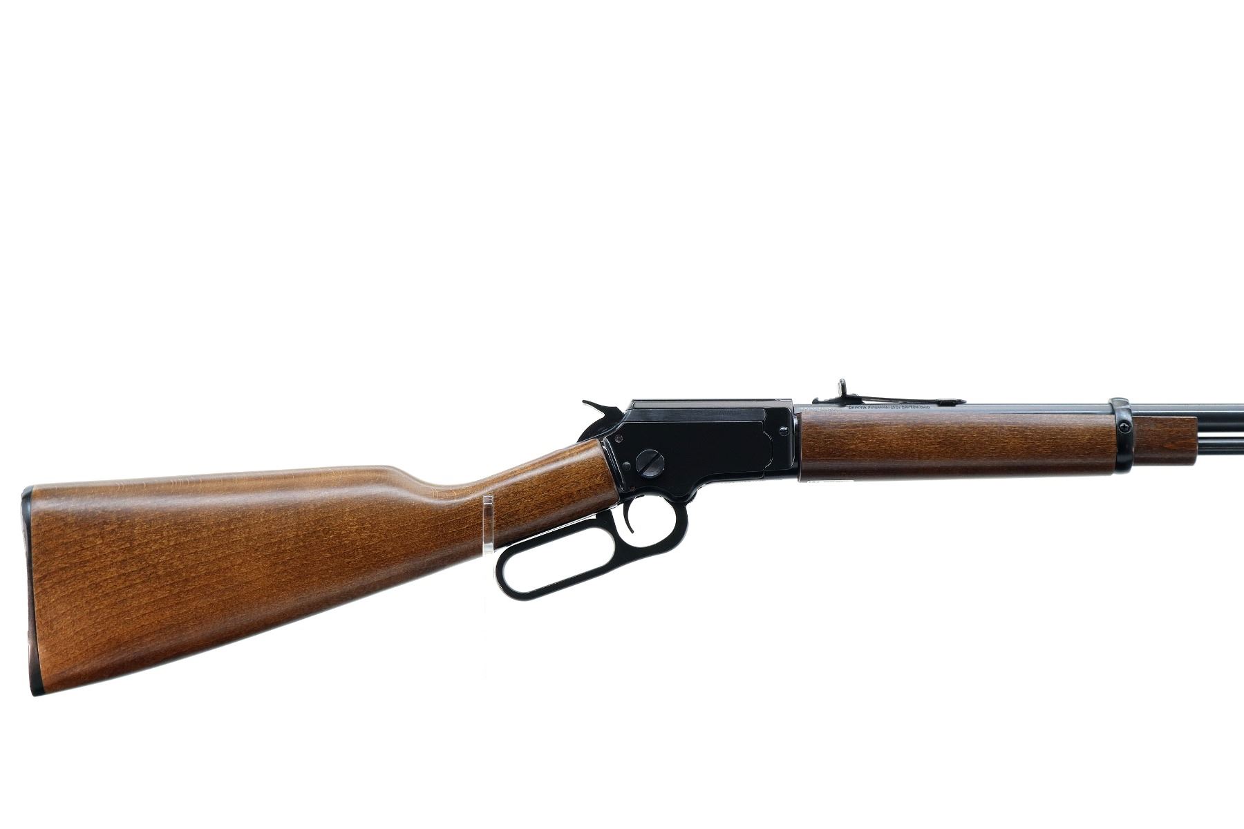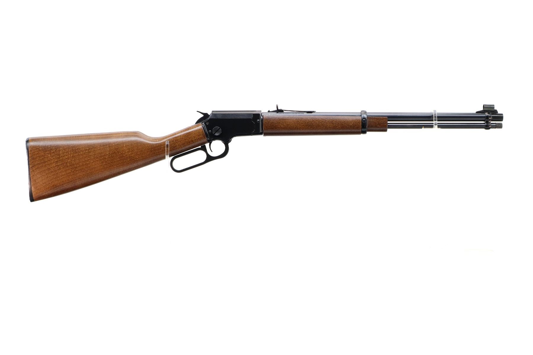 Main Description: Blade front sight with hood and ramp, adjustable u notched rear sight, blued round barrel and full length magtube, grooved black alloy receiver and spur hammer. Two piece wood stocks, straight grip, grooved black polymer butt plate, retains factory sticker.