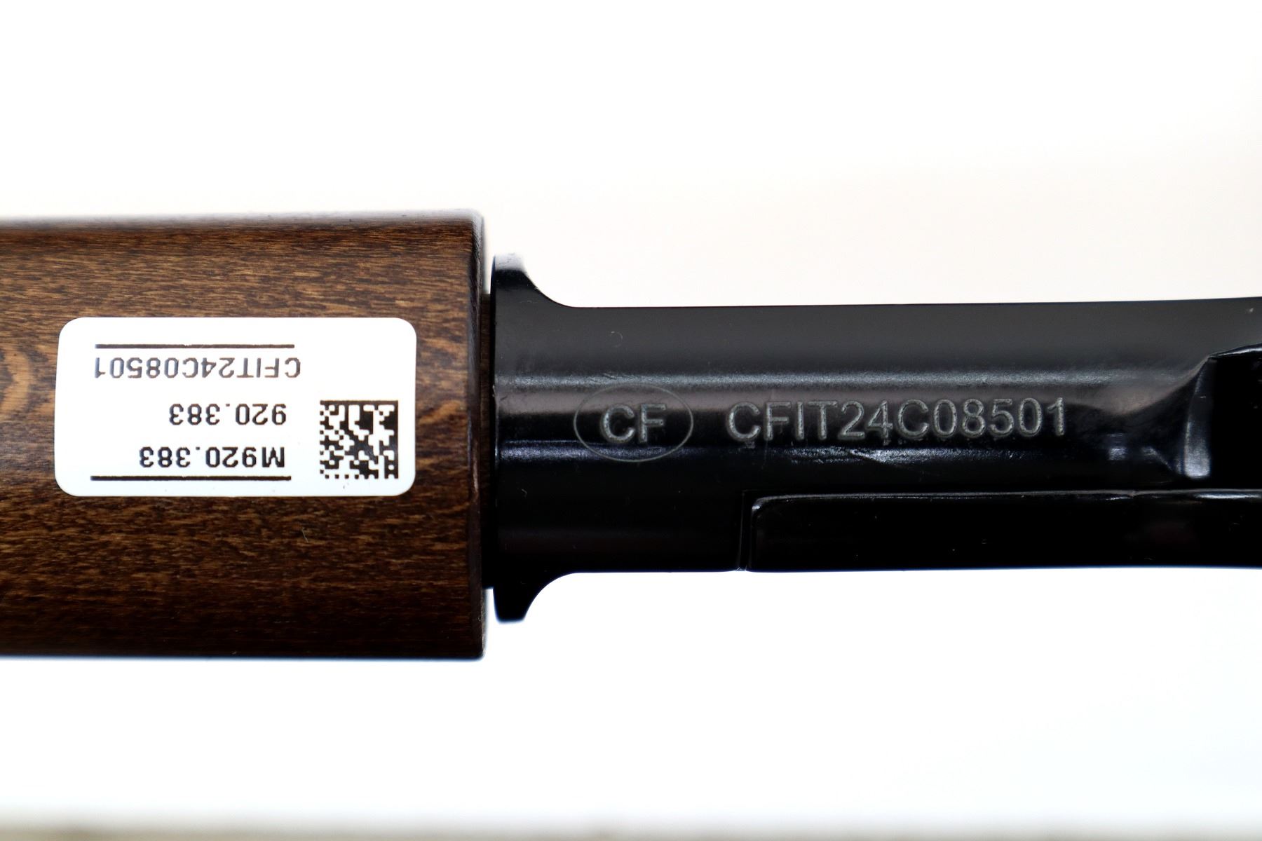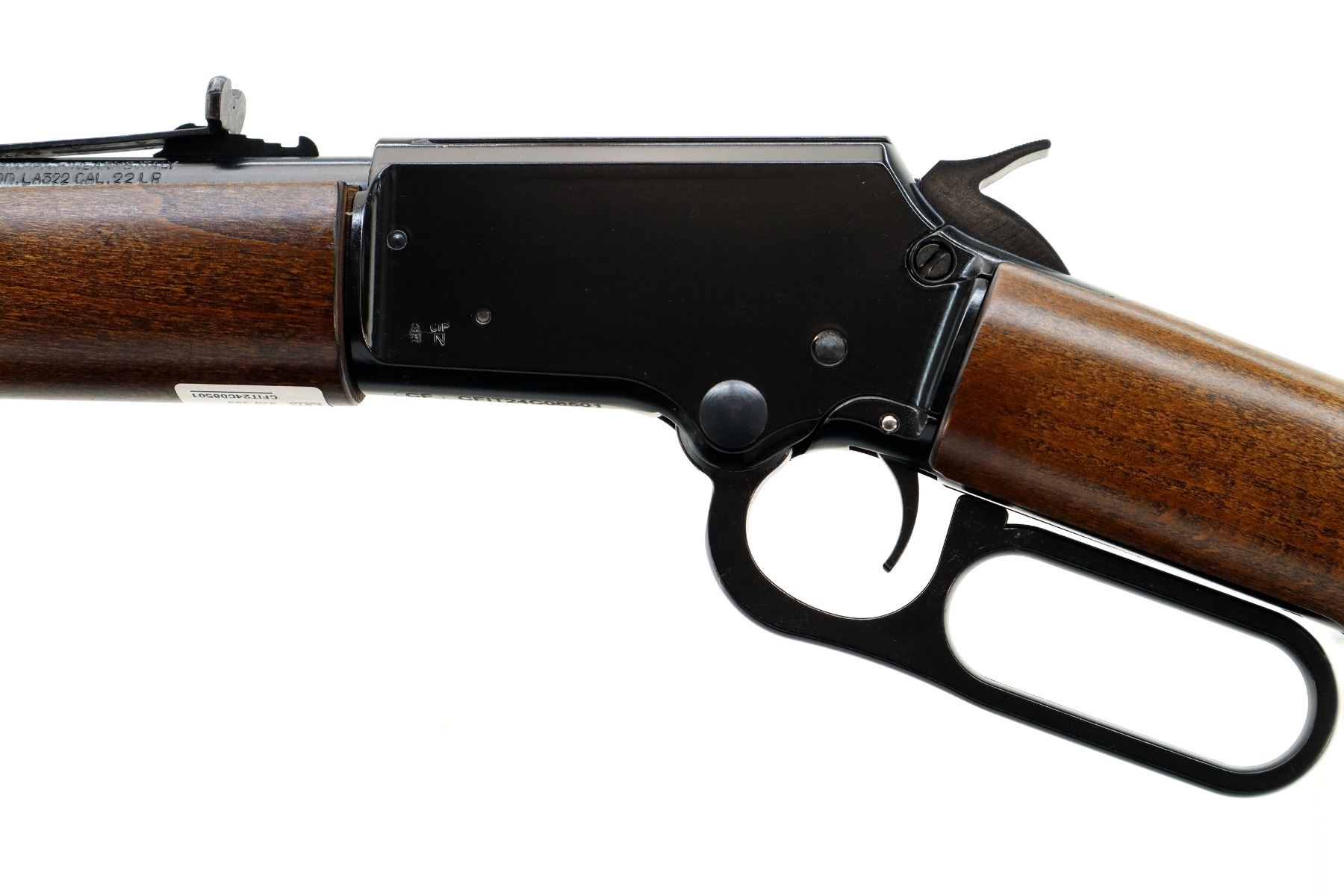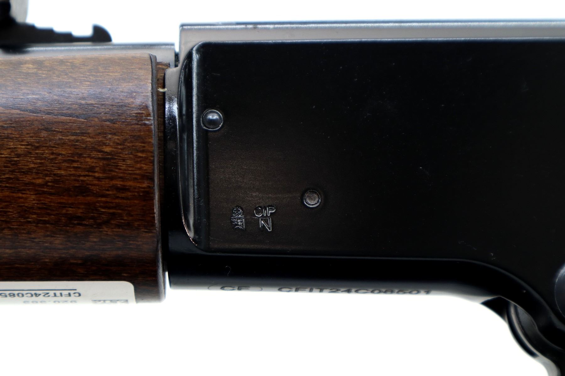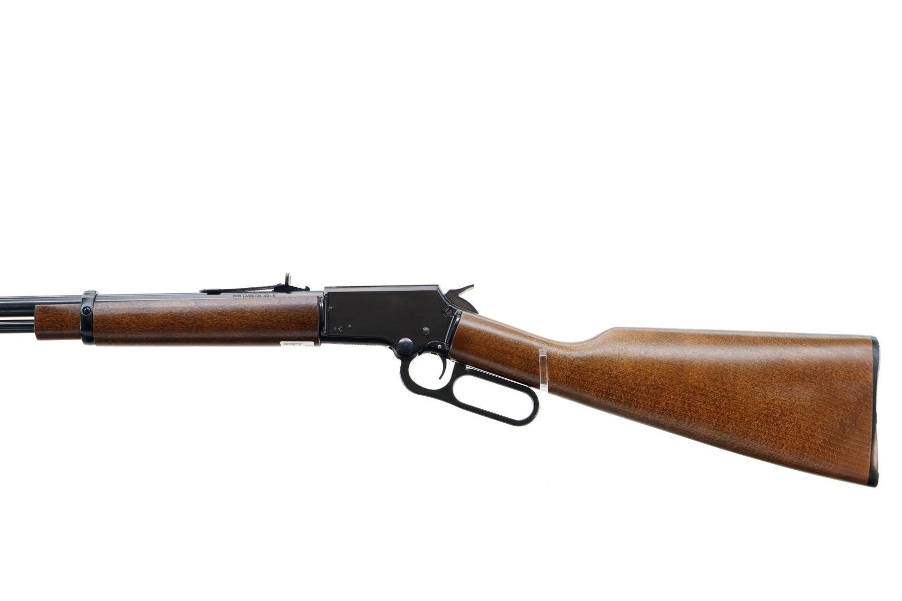 Main Description: Blade front sight with hood and ramp, adjustable u notched rear sight, blued round barrel and full length magtube, grooved black alloy receiver and spur hammer. Two piece wood stocks, straight grip, grooved black polymer butt plate, retains factory sticker.