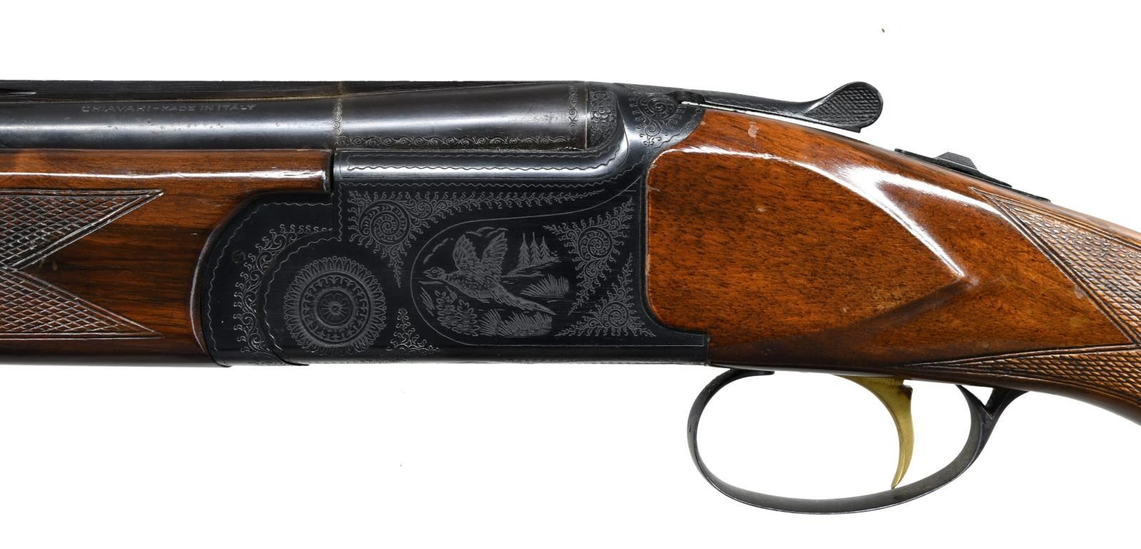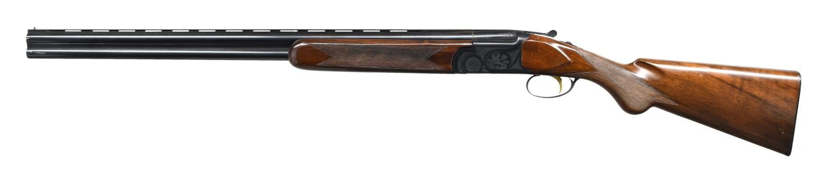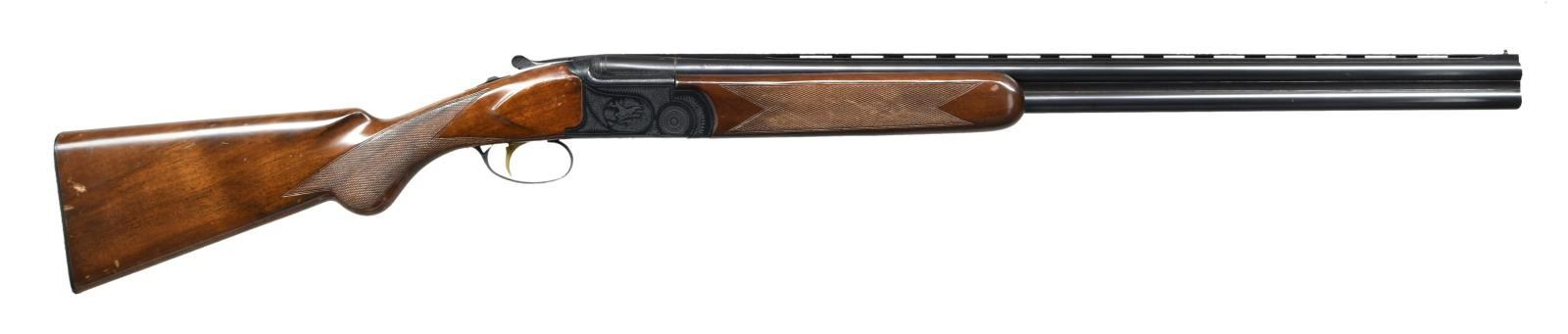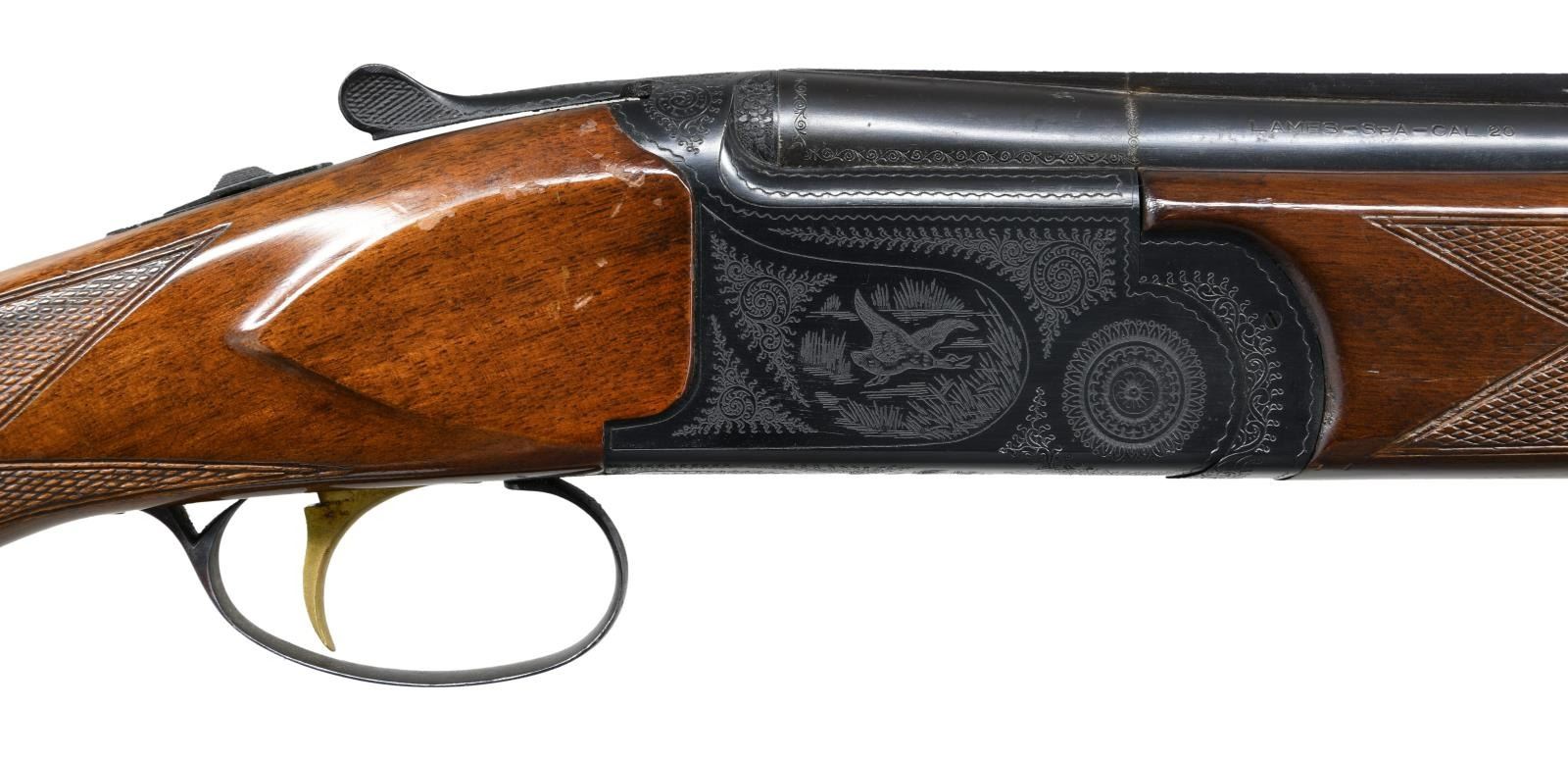 Cal. 20 Ga. S# 3240. Bbl. 28" VR w/ fixed "IM" over "CYL" chokes. Blued finish, ejectors, gold color trigger & lovely near full coverage engraved frame w/ games scenes either side & on the belly w/ balance scroll & floral pattern. Checkered beavertail forend & round knob pistol grip buttstock w/ LOP of 13 5/8" to factory buttplate. CONDITION: ejectors do not work. Metal retains about 90% blue w/ scratches, light dings, a few flecks of white paint & scattered light rust. Stock set has light dings on forend & moderate to perhaps heavy dings, dents & gouges on stock. Bores are very good, bright & shiny. PROVENANCE: From the estate collection of Thomas J. Mulligan. (23-1239/CW). MODERN. $400-600.