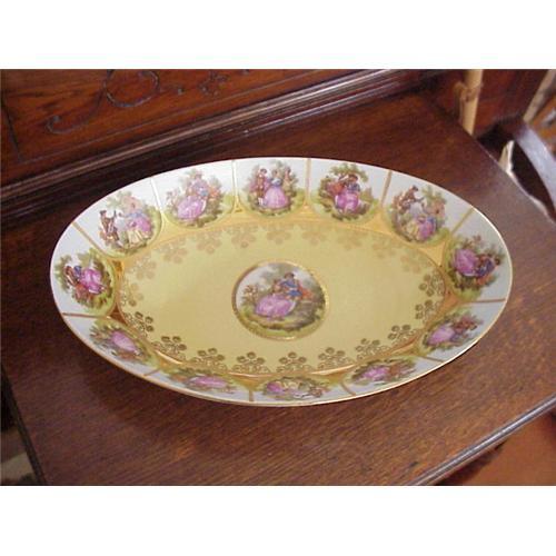 <table width="100%" border="0" cellspacing="0" cellpadding="4"><tr><td><em> </em></td></tr><tr> <td width="100%"> If you love the Shabby Chic Romantic Cottage décor, then you will love this absolutely beautiful romantic pattern entitled LOVE STORY. This fine china has hand painted scenes of the French court, from the original paintings presented to Madam Du Barry, French courtesan to King Louis the XV. The original paintings were by the famous French artist Jean Fragonard, who was born in France in 1732. Among his finest works were a group of four panels known as The Romance Of Young Love. They portray the free and romantic life of the French court and were especially painted for Madam Du Barry. The paintings were later purchased by the American Pierpont Morgan. In 1915 they were acquired for the Frick collection where there is a special room dedicated to these beautiful paintings. This is a very large collection we just acquired with many pieces of this gorgeous pattern, so please be sure to view our other listings. This is a gorgeous large oval bowl. It is stunning with the different panels of scenes of the French court. The use of gold and gold raised beading is exquisite as is the lace like gold pattern. The background color is a beautiful buttery yellow, just so beautiful! This fine cake plate measures about 12 inches by 8 inches , in excellent condition, absolutely perfect and gorgeous! It was imported by the world famous china shop Cassidy?s from West Germany in the 1950s. Can you just image it in your cabinet! If you love antique lace and linens, all things ...