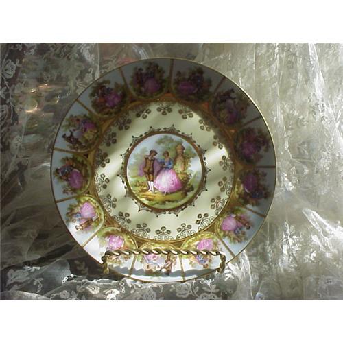 If you love the Shabby Chic Romantic Cottage décor, then you will love this absolutely beautiful romantic pattern entitled LOVE STORY. This fine china has hand painted scenes of the French court, from the original paintings presented to Madam Du Barry, French courtesan to King Louis the XV. The original paintings were by the famous French artist Jean Fragonard, who was born in France in 1732. Among his finest works were a group of four panels known as The Romance Of Young Love. They portray the free and romantic life of the French court and were especially painted for Madam Du Barry. The paintings were later purchased by the American Pierpont Morgan. In 1915 they were acquired for the Frick collection where there is a special room dedicated to these beautiful paintings. This is a very large collection we just acquired with many pieces of this gorgeous pattern, so please be sure to view our other listings. This particular piece is a gorgeous large plate. It is stunning with the different panels of scenes of the French court. The use of gold and gold raised beading is exquisite as is the lace like gold pattern. The background color is a beautiful buttery yellow, just so beautiful! This fine plate measures about 10 inches across , in excellent condition, absolutely perfect and gorgeous! It was imported by the world famous china shop Cassidy?s from West Germany in the 1950s. Can you just image it in your cabinet! If you love antique lace and linens, all ...